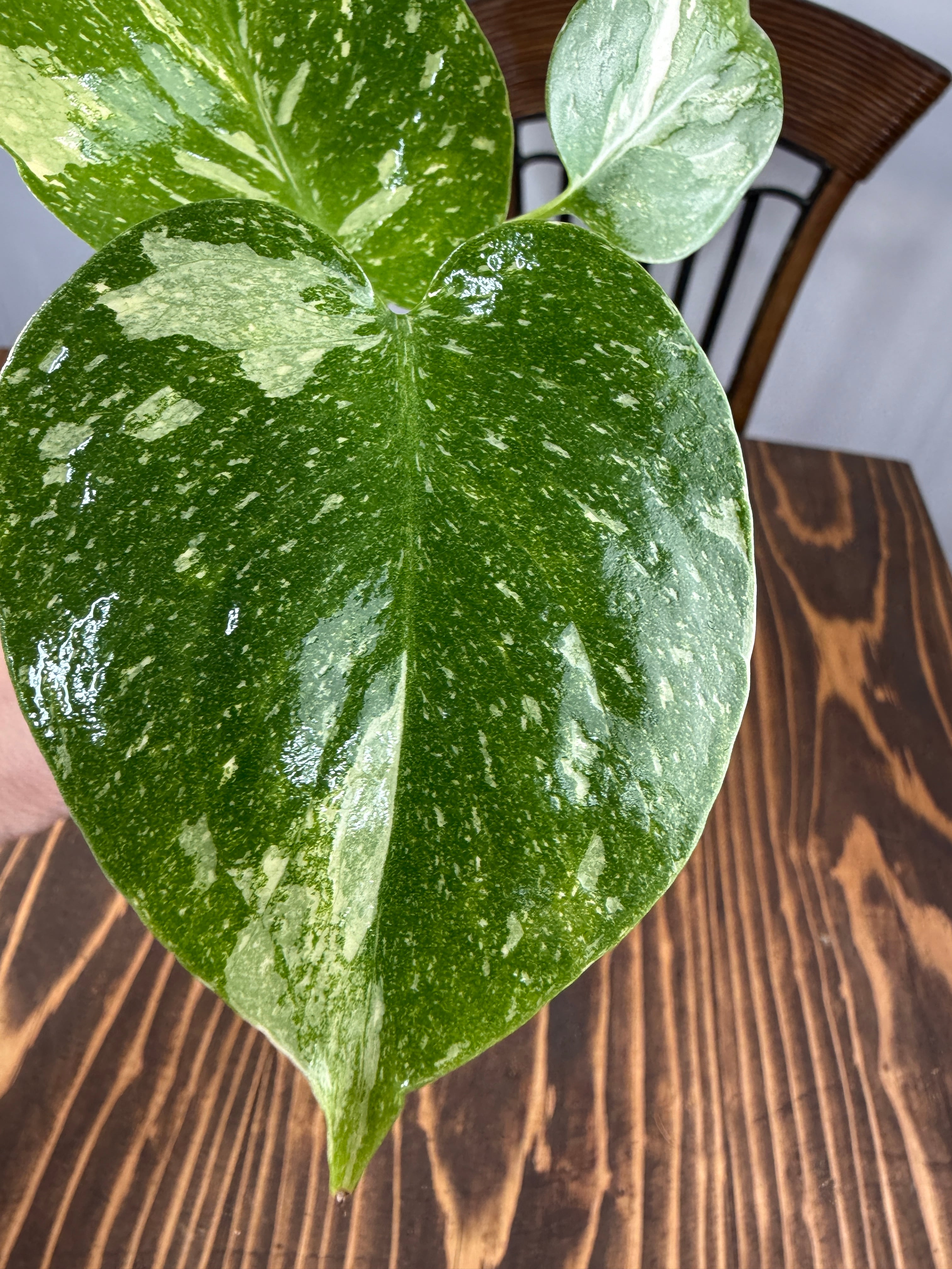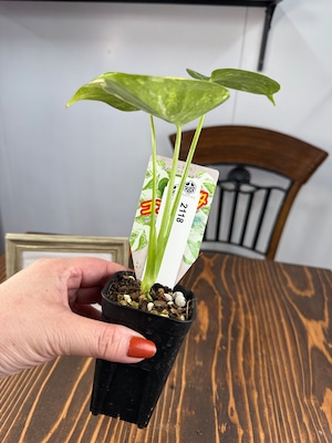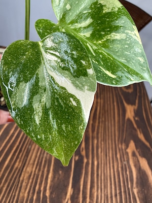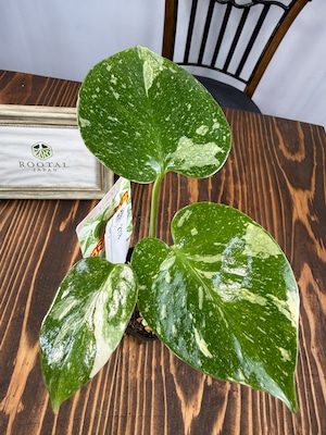 モンステラ タイコンステレーション コンパクタの葉は、ユニークなバリエガータが印象的で、成長段階によってその美しさが変わります。出荷時のサイズはおおよそ20㎝程度で、かわいらしいベビー苗をお届けいたします。