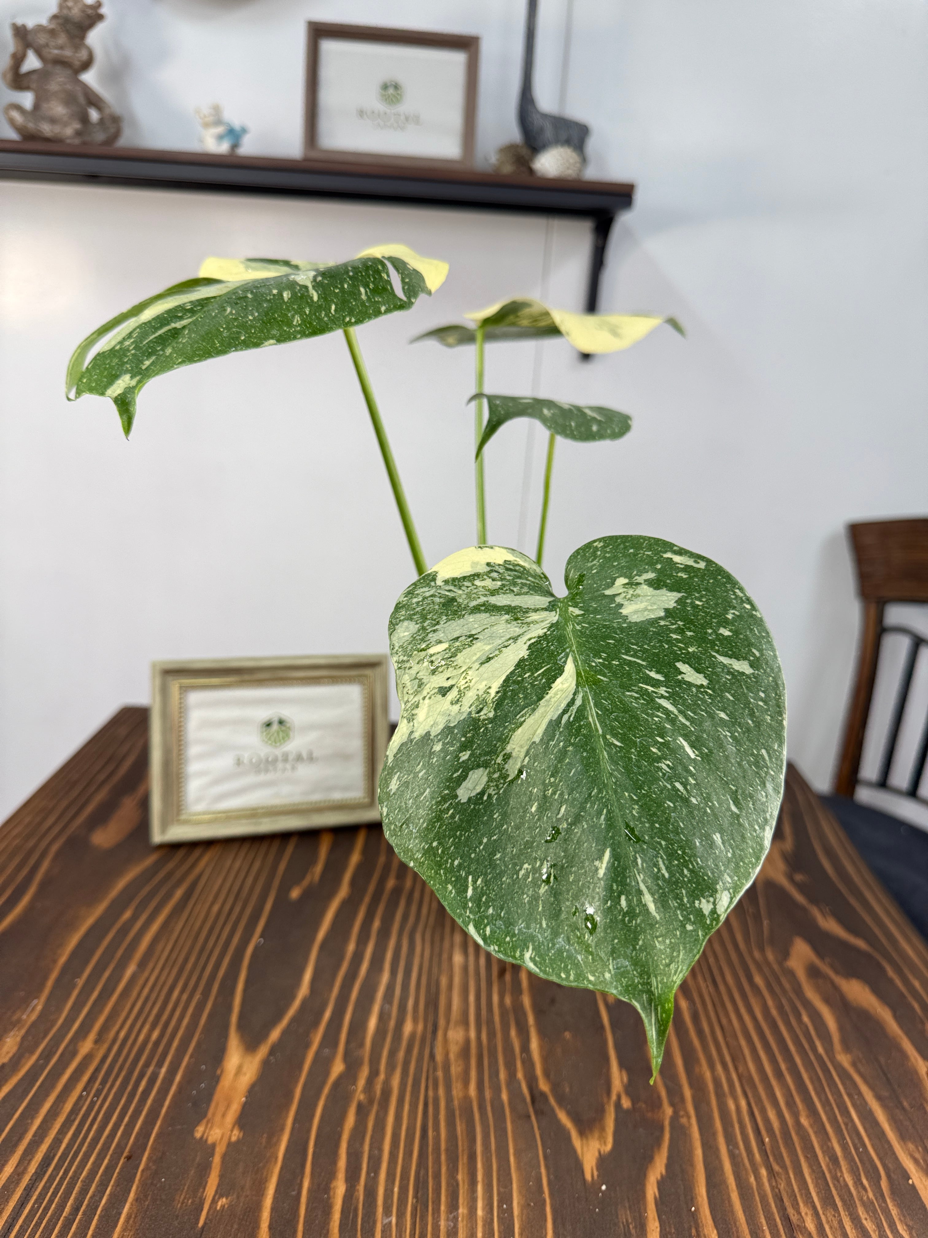 モンステラ デリシオーサ タイコンステレーションの葉は、ユニークなバリエガータが印象的で、成長段階によってその美しさが変わります。出荷時のサイズはおおよそ50㎝程度で、かわいらしいベビー苗をお届けいたします。