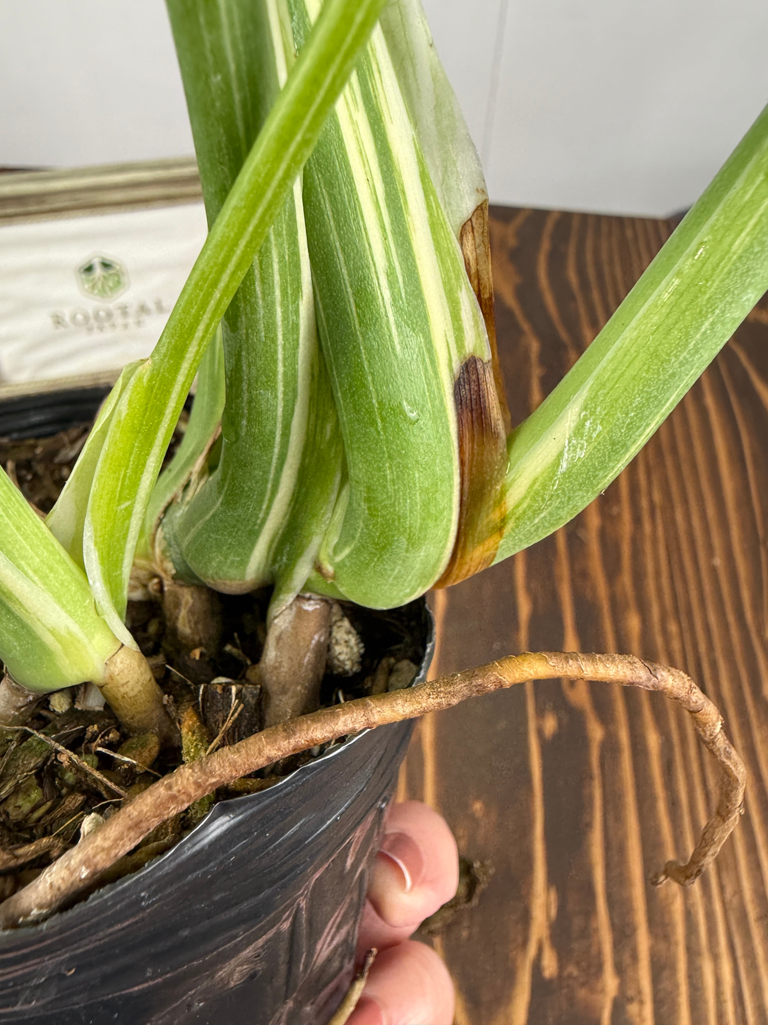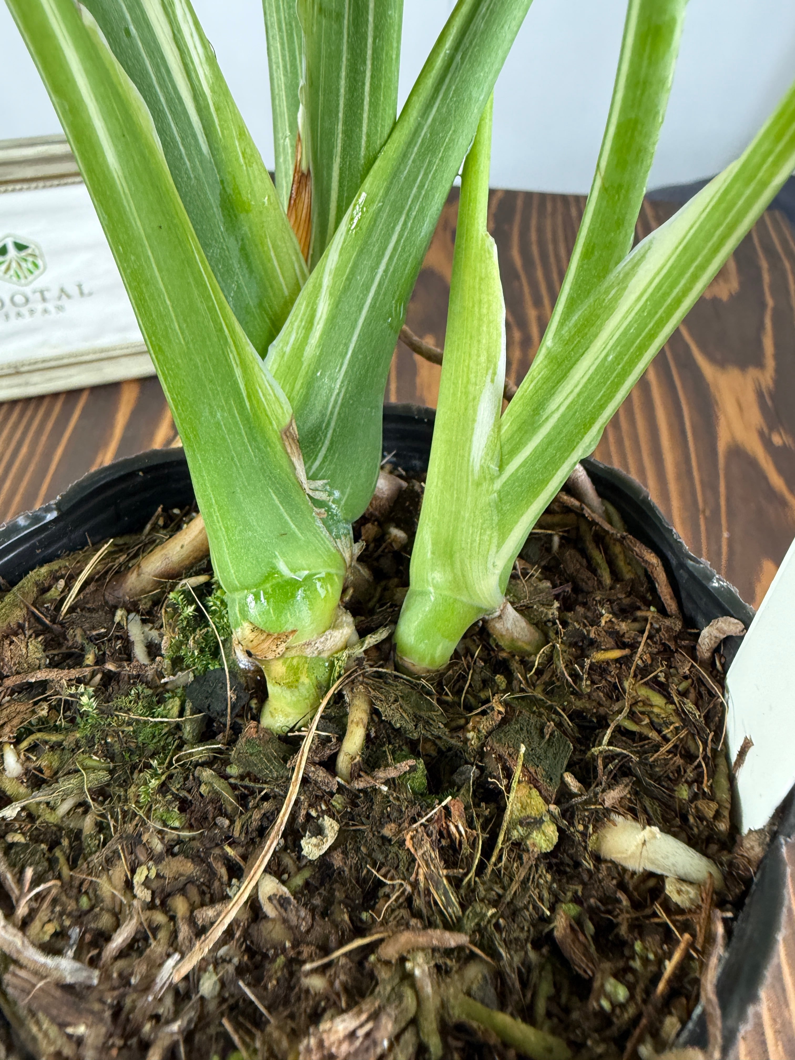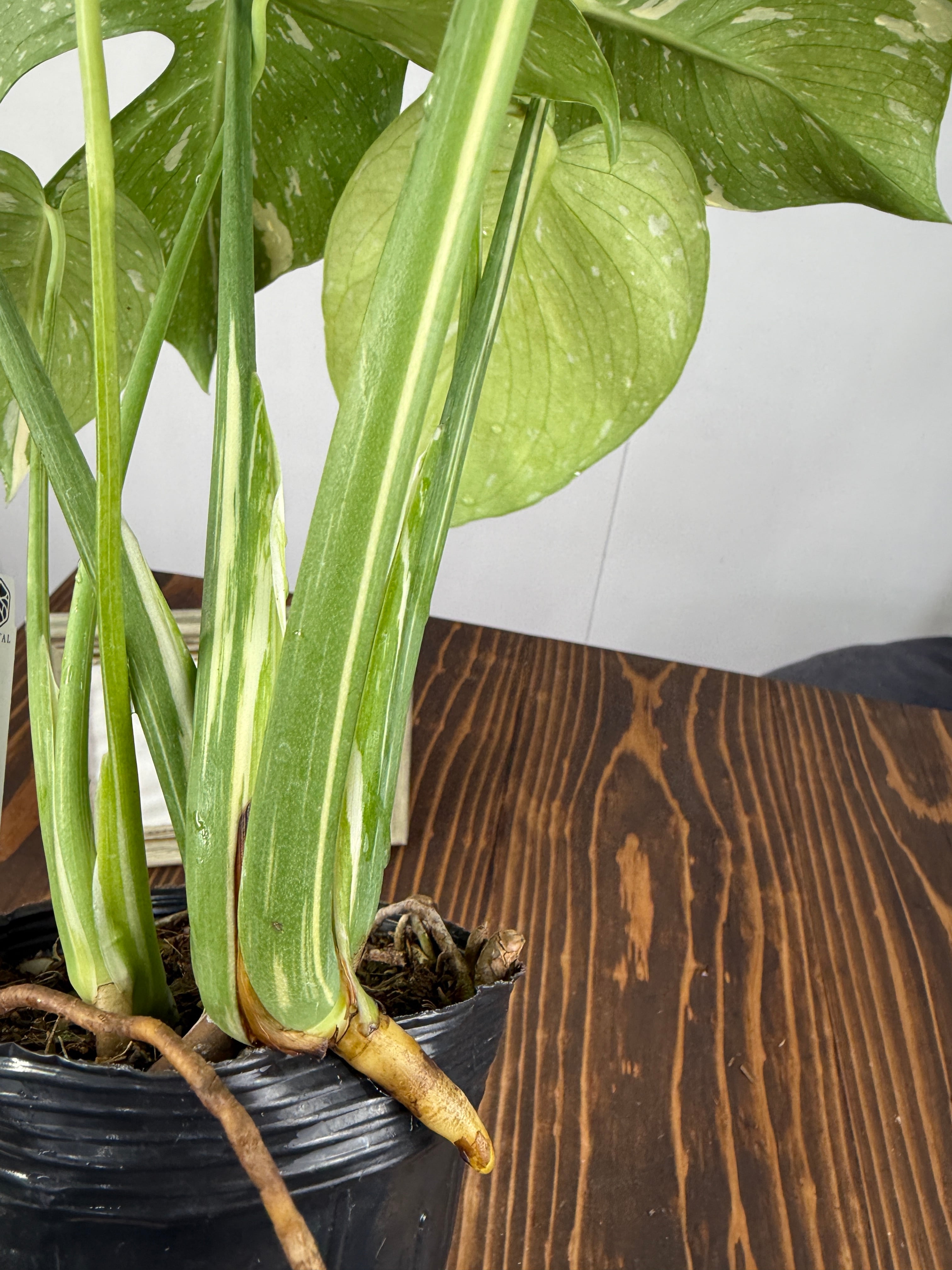 モンステラ デリシオーサ タイコンステレーションの葉は、ユニークなバリエガータが印象的で、成長段階によってその美しさが変わります。出荷時のサイズはおおよそ50㎝程度で、かわいらしいベビー苗をお届けいたします。