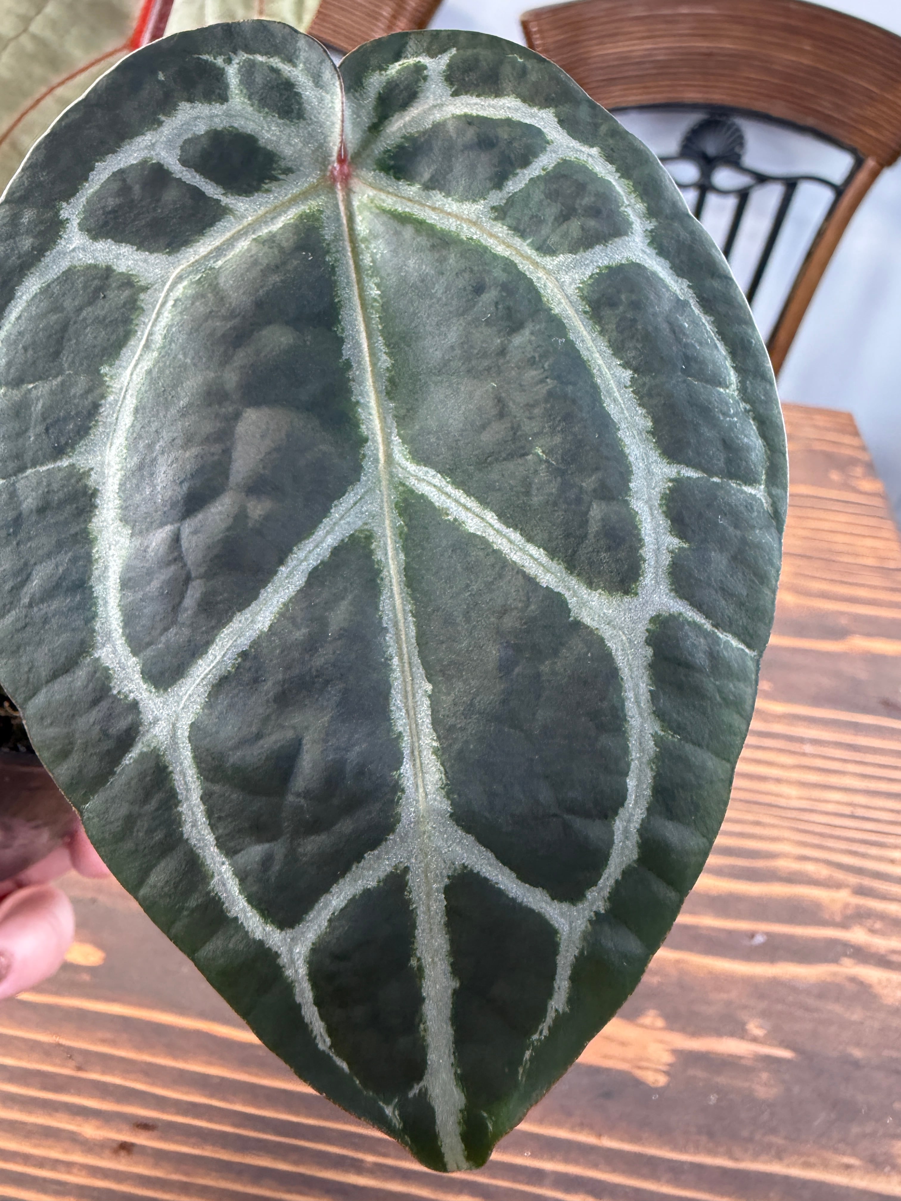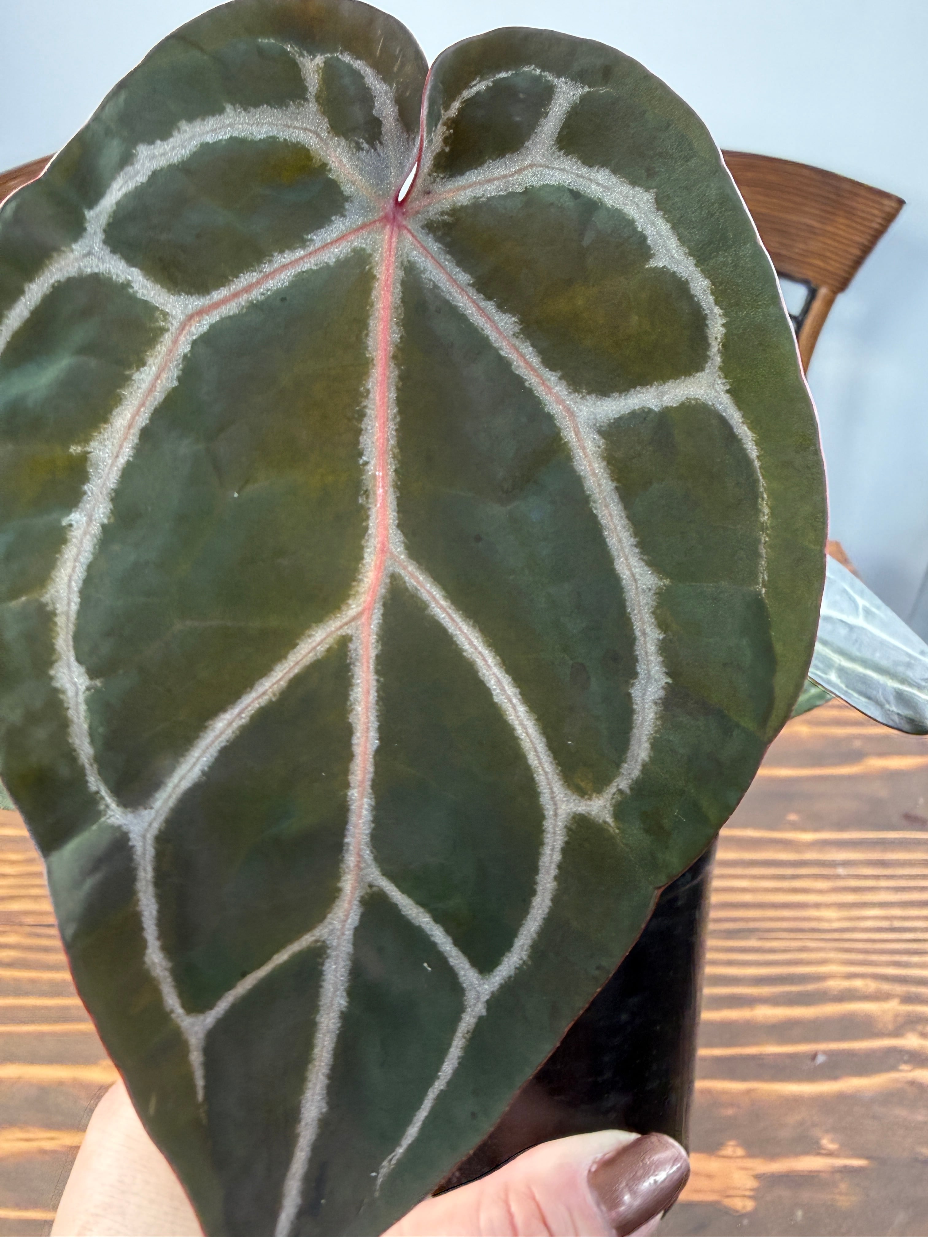 アンスリウム レッドクリスタリナム♯1×♯2の葉は、深緑色の艶やかさが魅力を引き立てます。出荷時のサイズは2.5号プラ鉢で、コンパクトながらも健康的に育った美しい個体をお届けいたします。