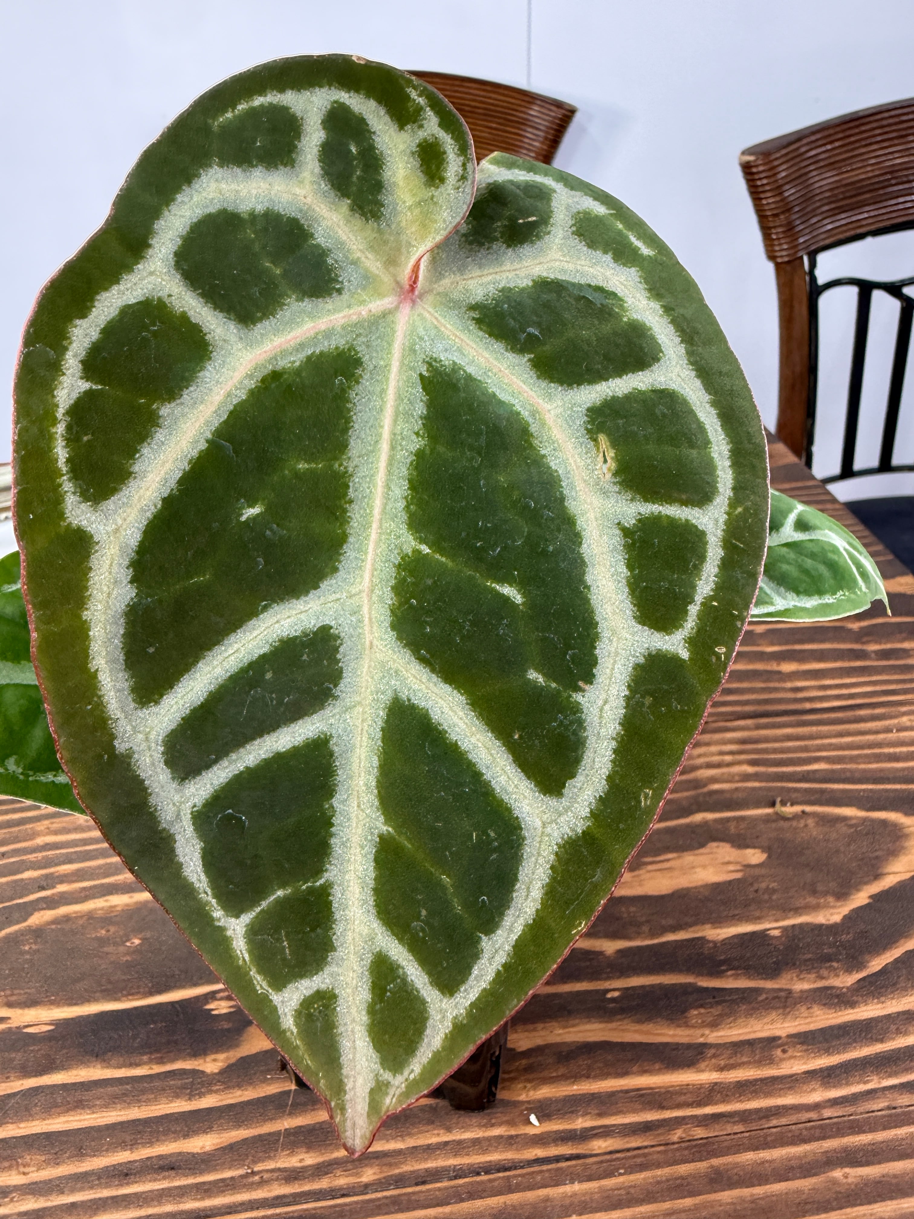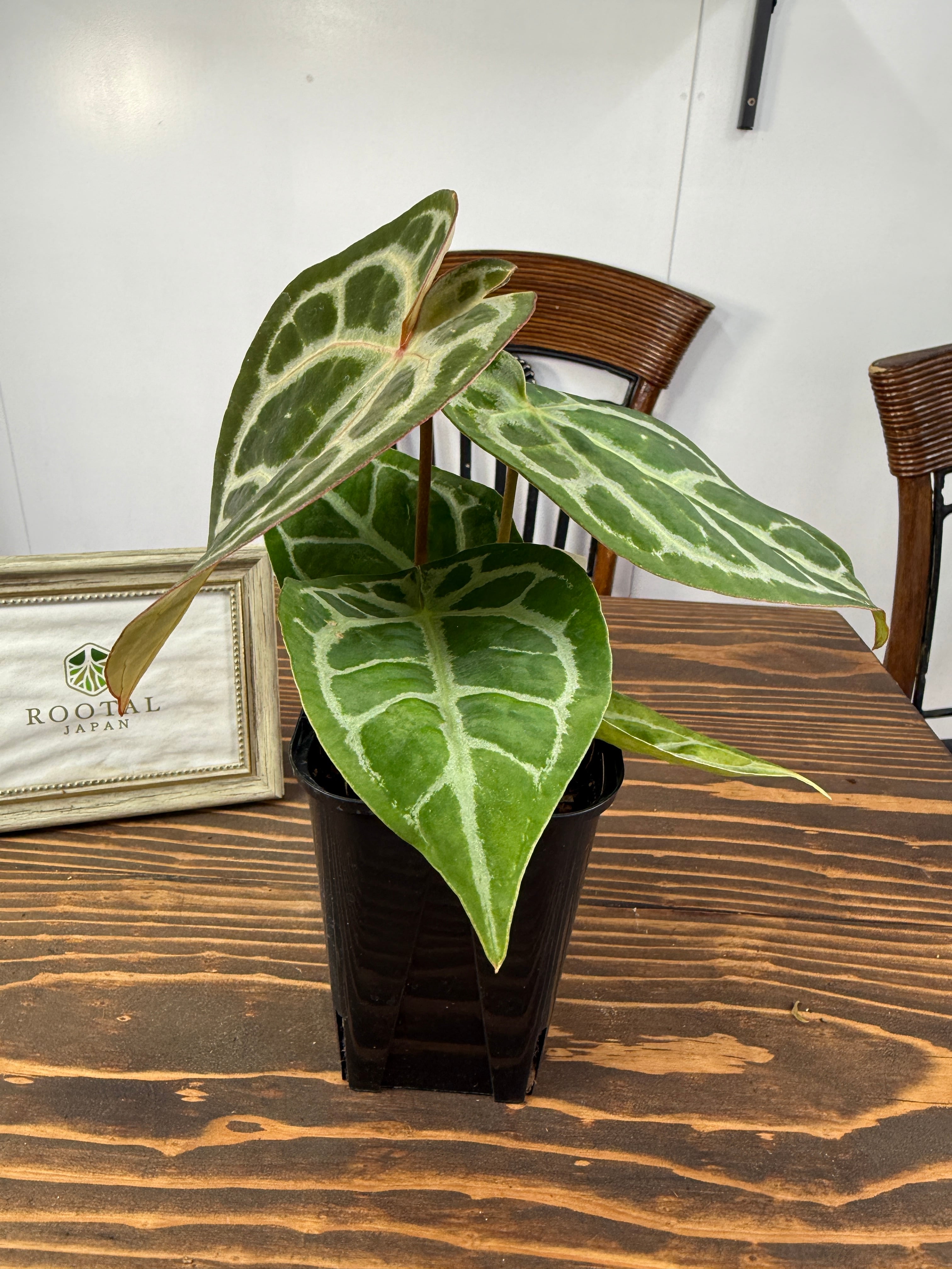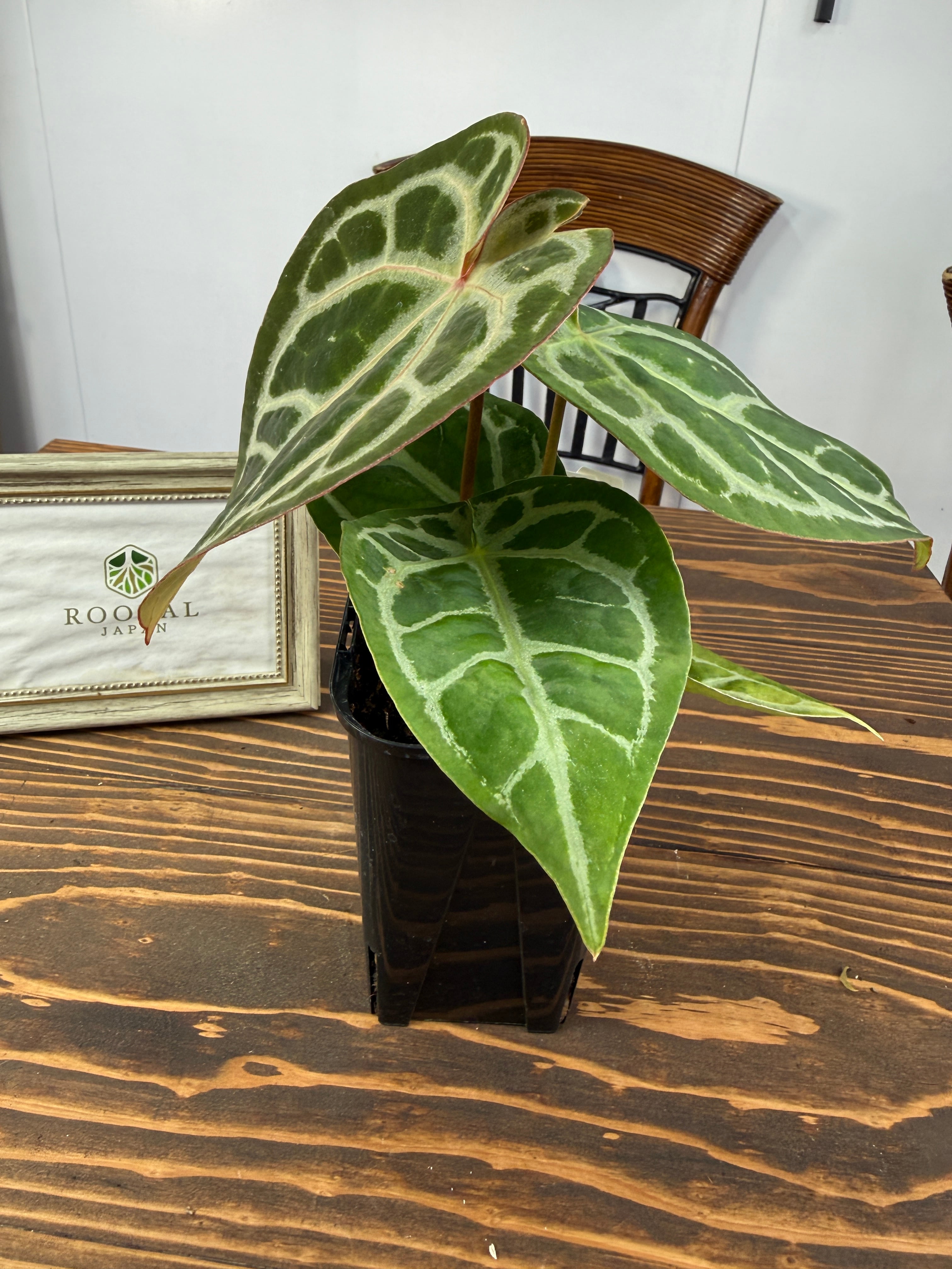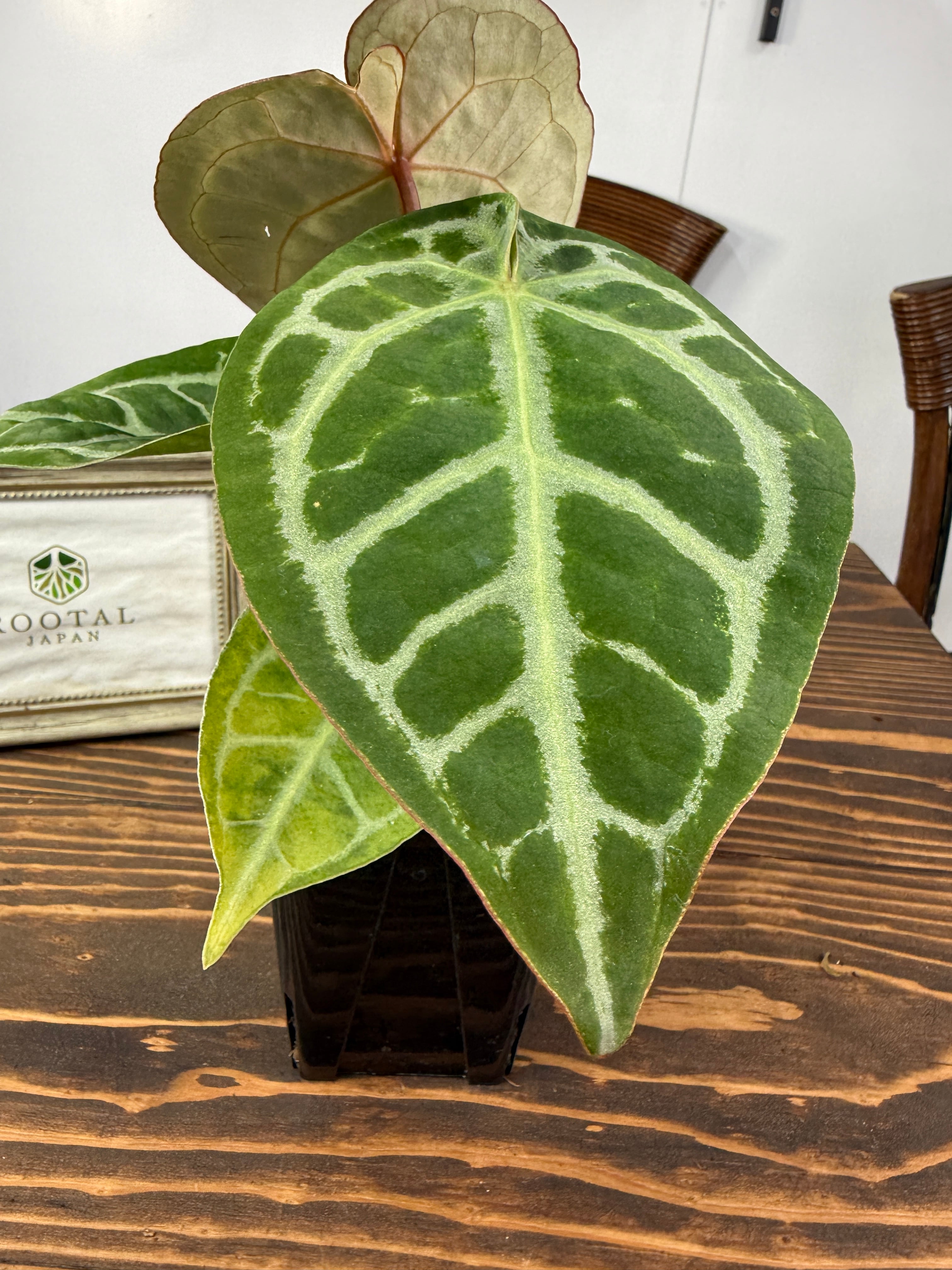 アンスリウム ピンクレモネード×レッドクリスタリナムの葉は、深い緑色に、愛らしいピンクが華やかさを添え、存在感を高めます。コンパクトながら健康的に育った美しい個体をお届けいたします。
