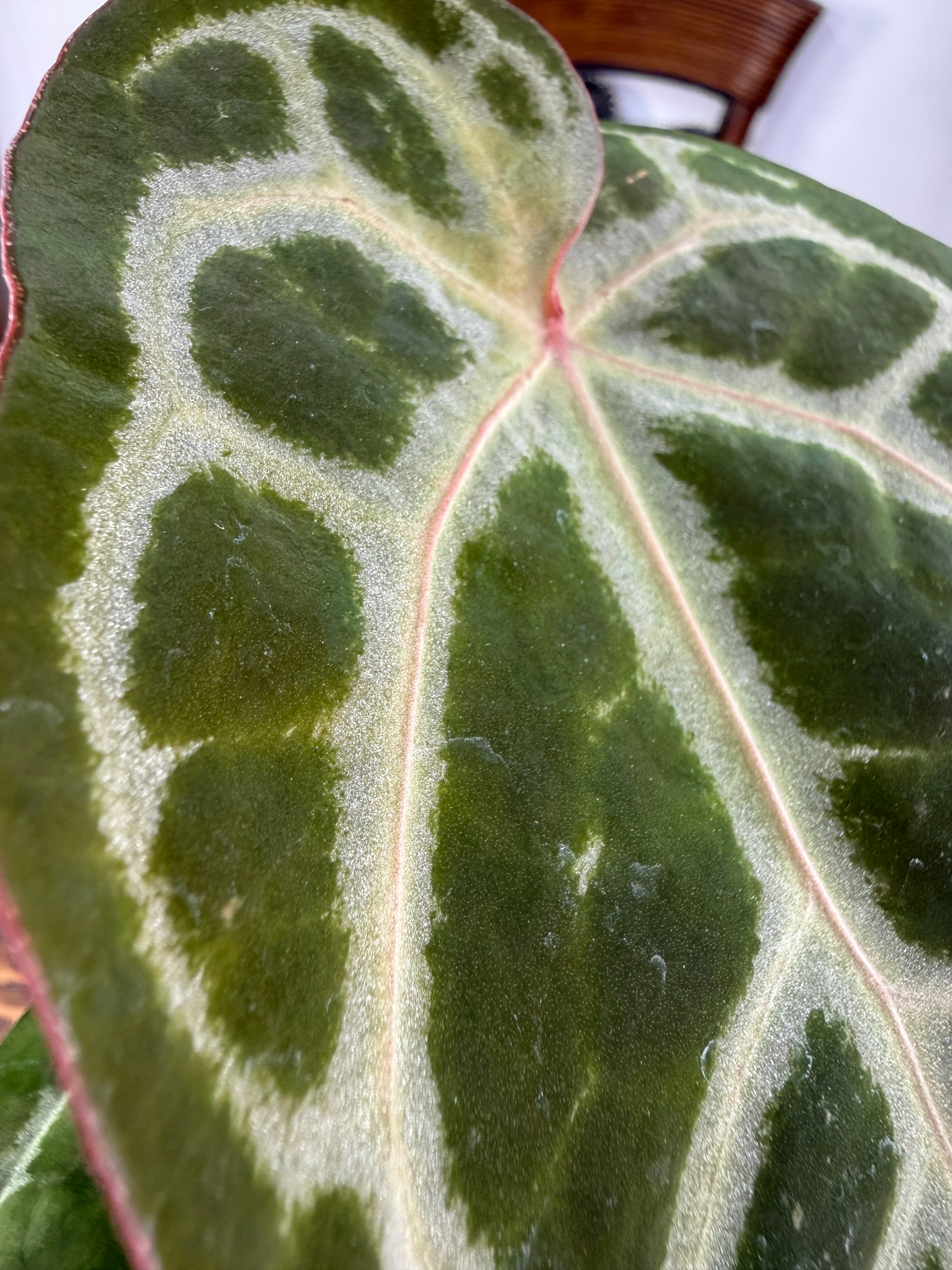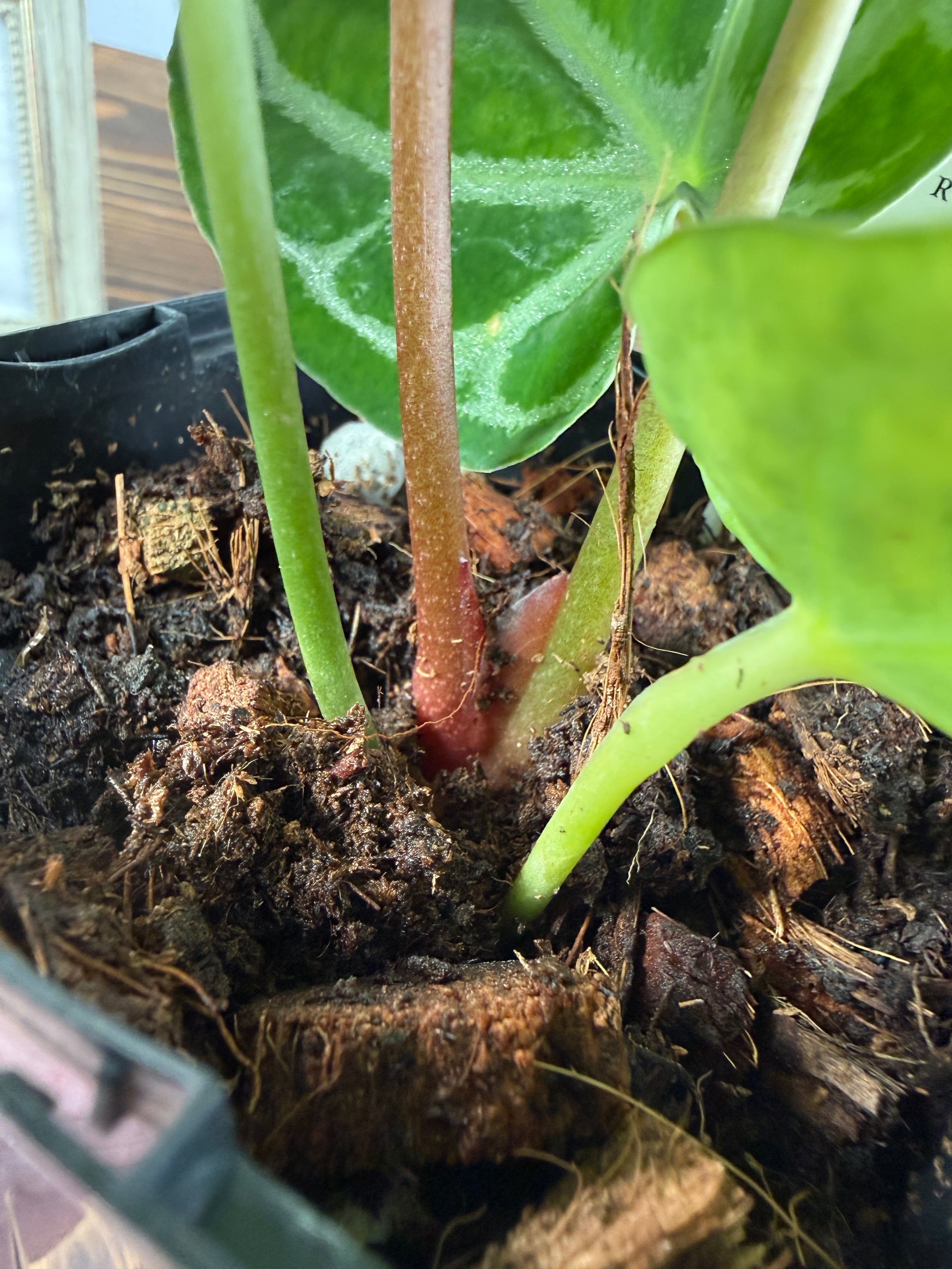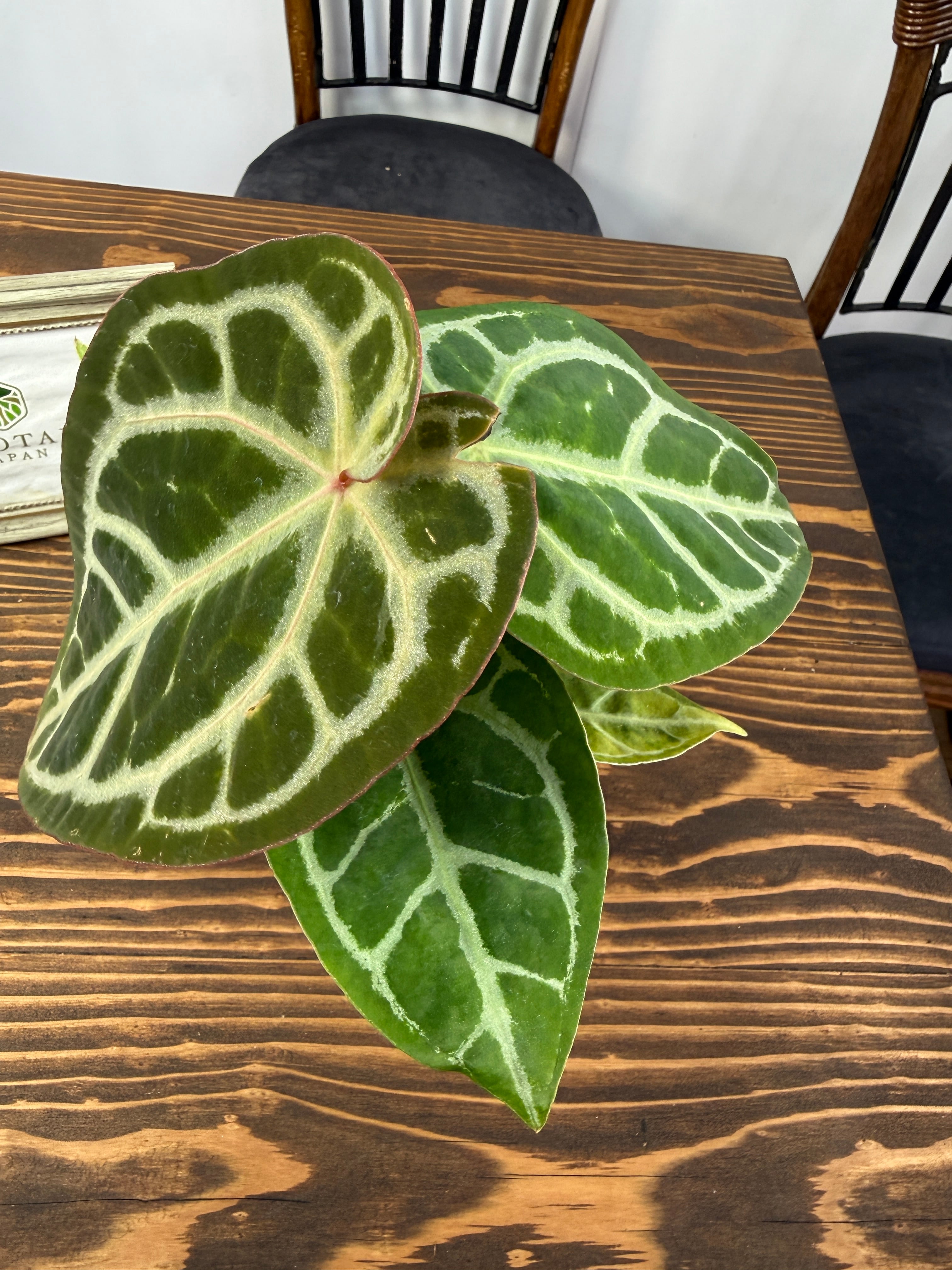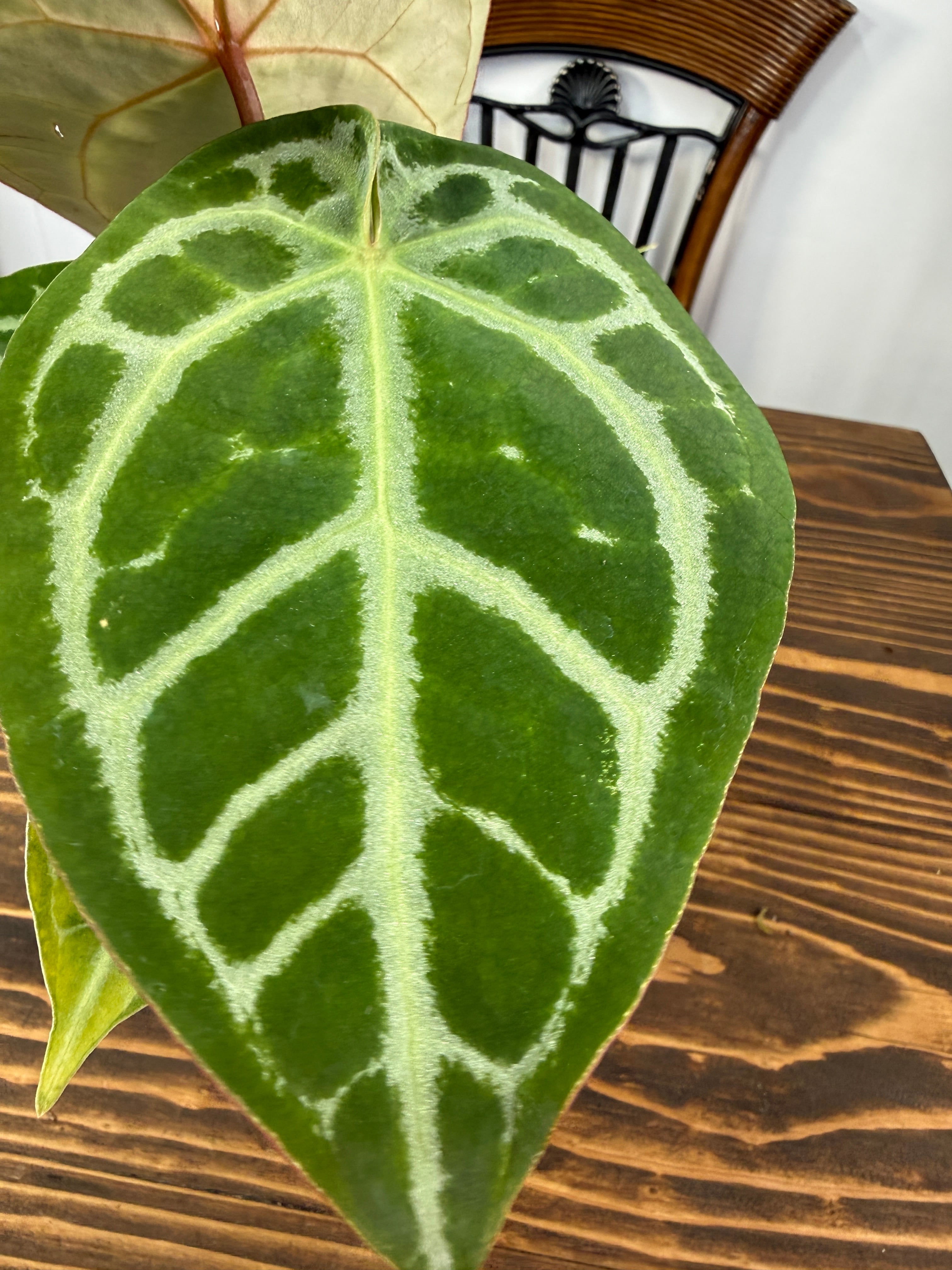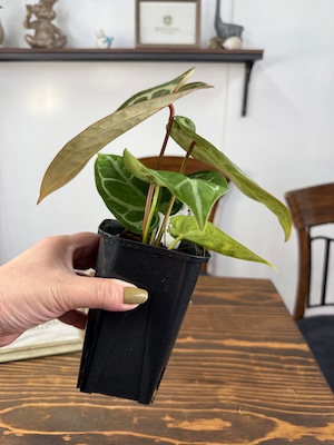 アンスリウム ピンクレモネード×レッドクリスタリナムの葉は、深い緑色に、愛らしいピンクが華やかさを添え、存在感を高めます。コンパクトながら健康的に育った美しい個体をお届けいたします。
