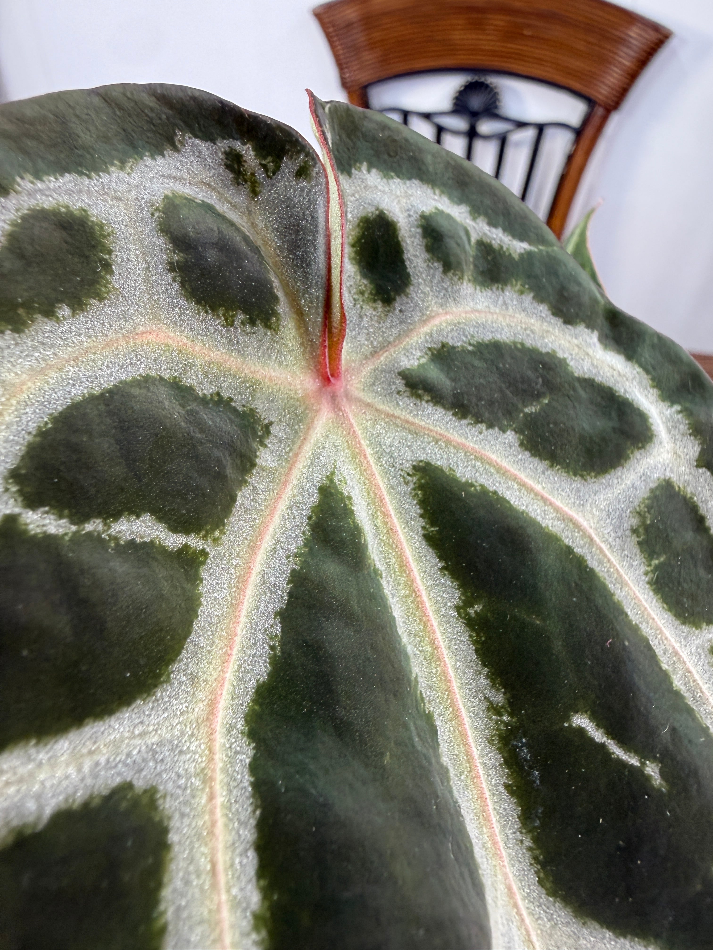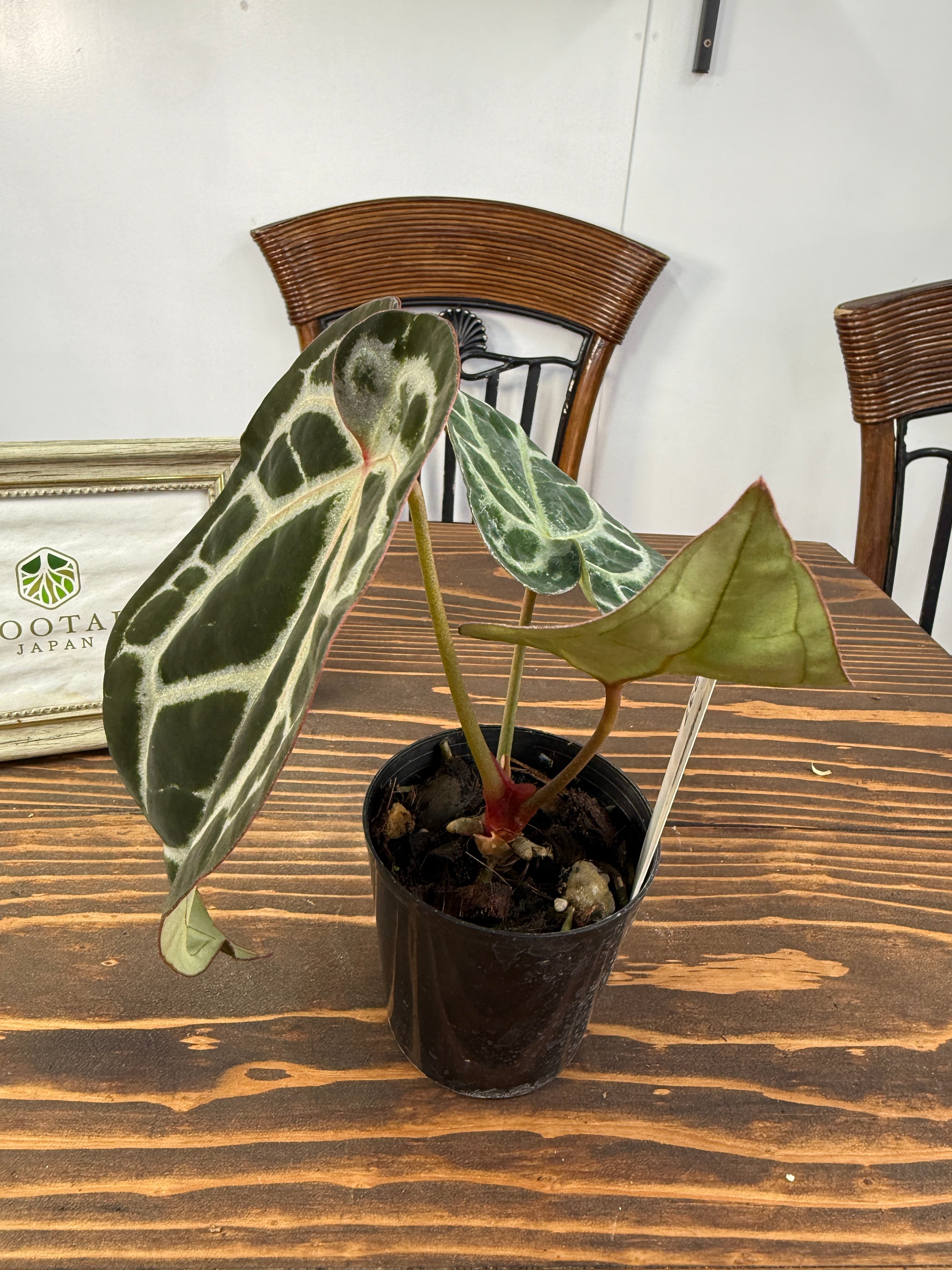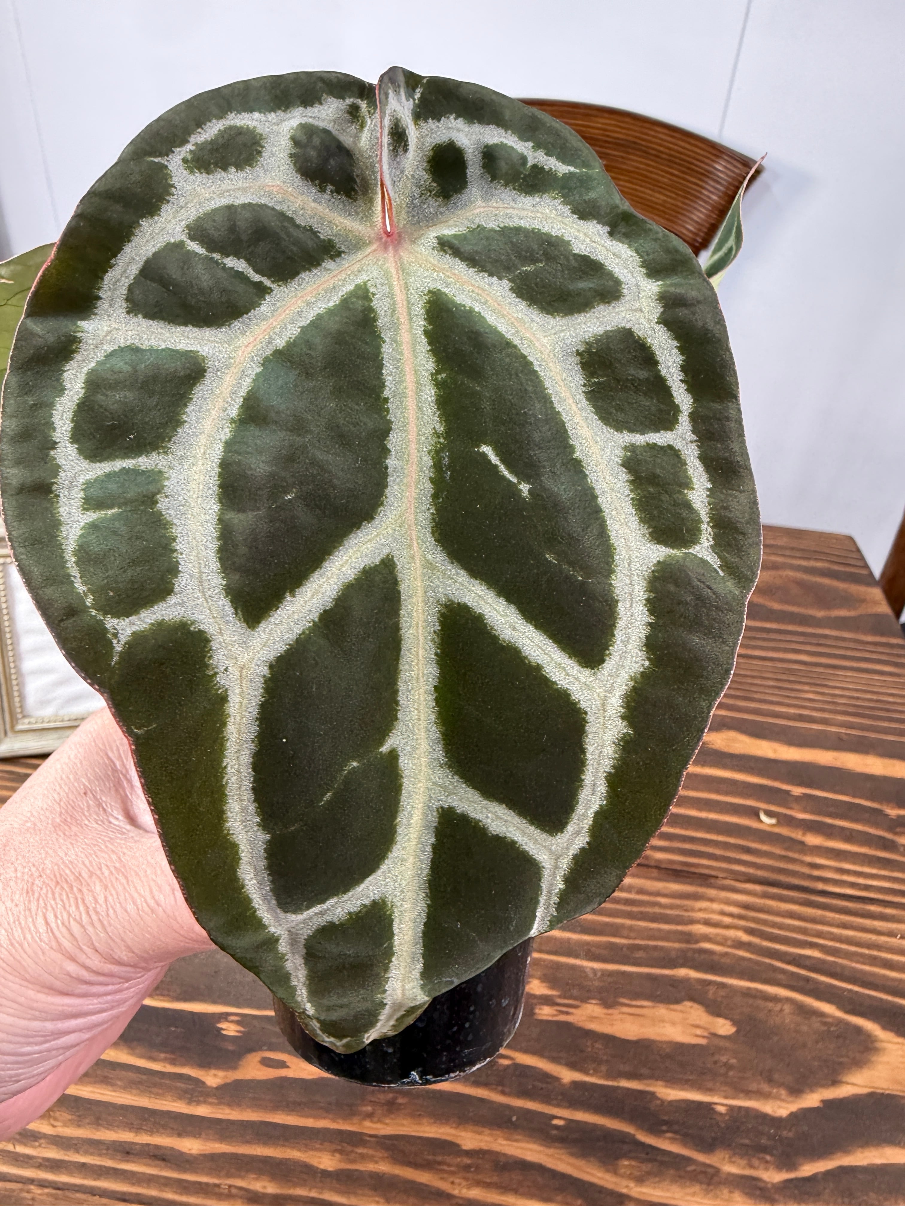 アンスリウム ピンクレモネード×レッドクリスタリナムの葉は、深い緑色に、愛らしいピンクが華やかさを添え、存在感を高めます。出荷時のサイズは2.5号プラ鉢で、コンパクトながら健康的に育った美しい個体をお届けいたします。