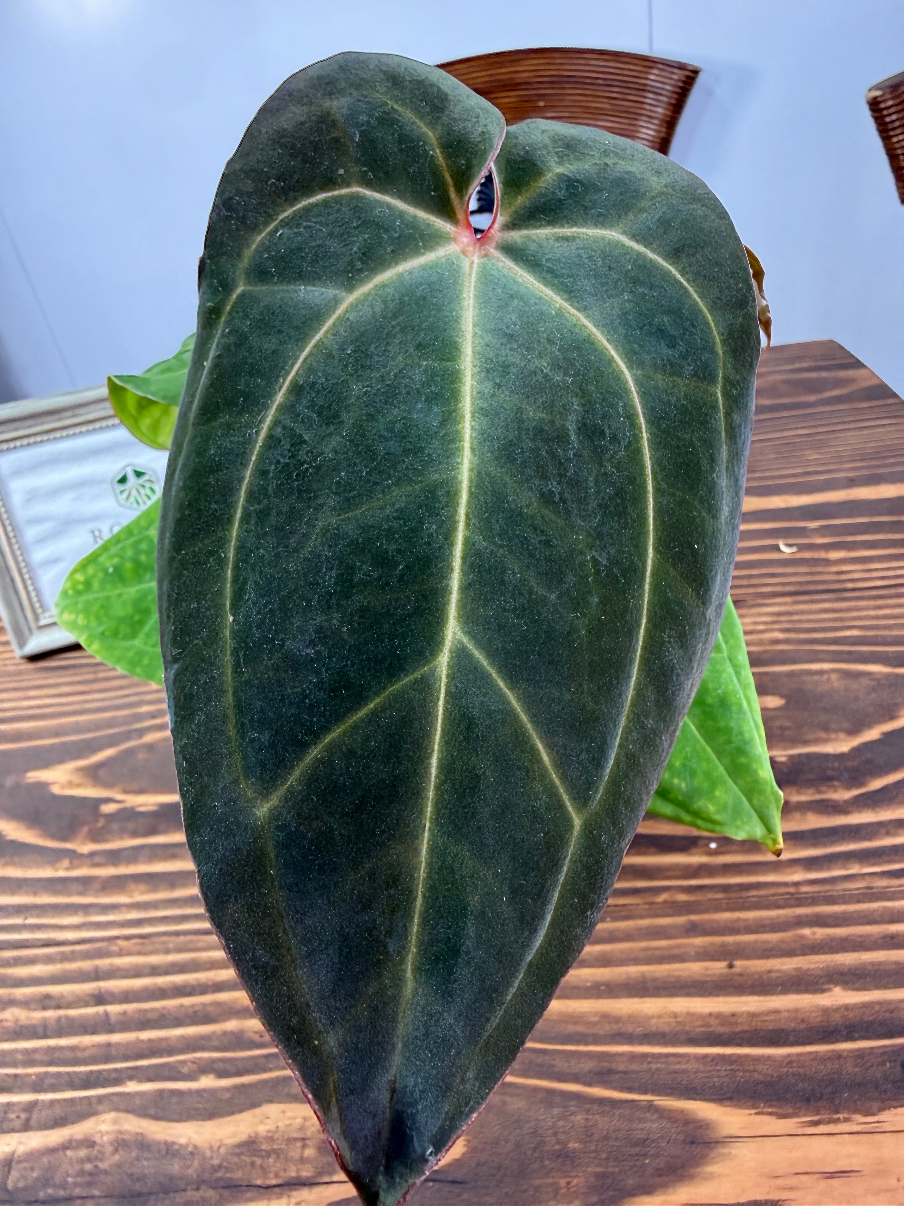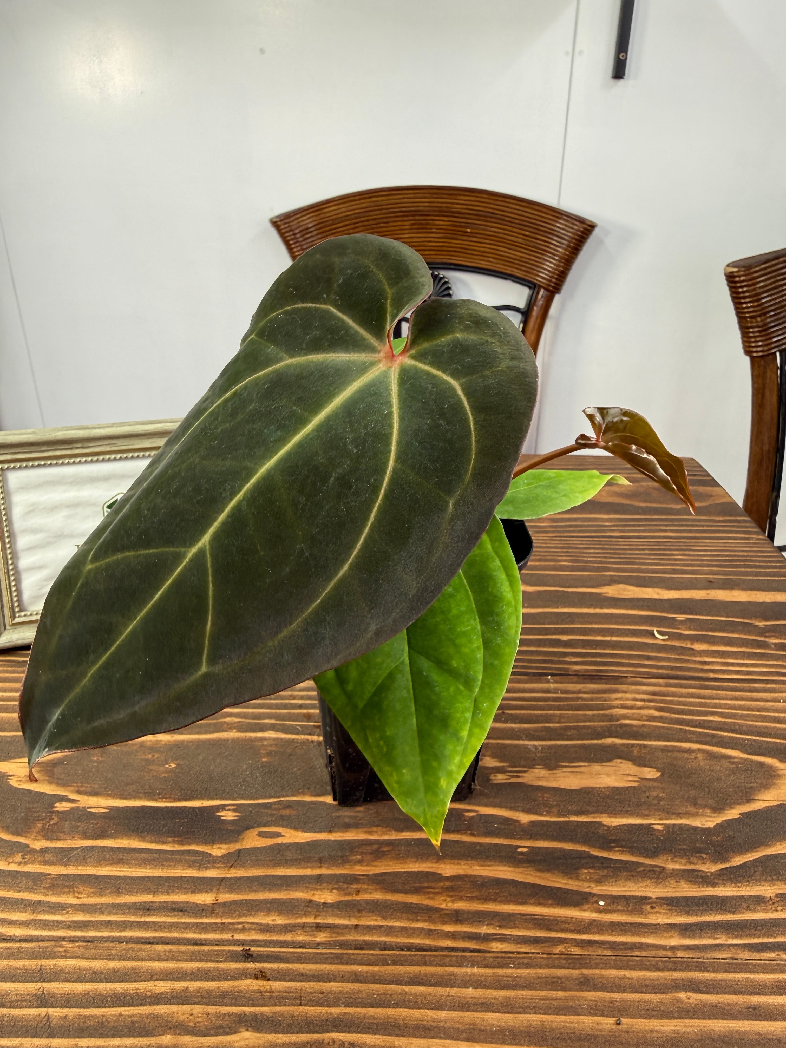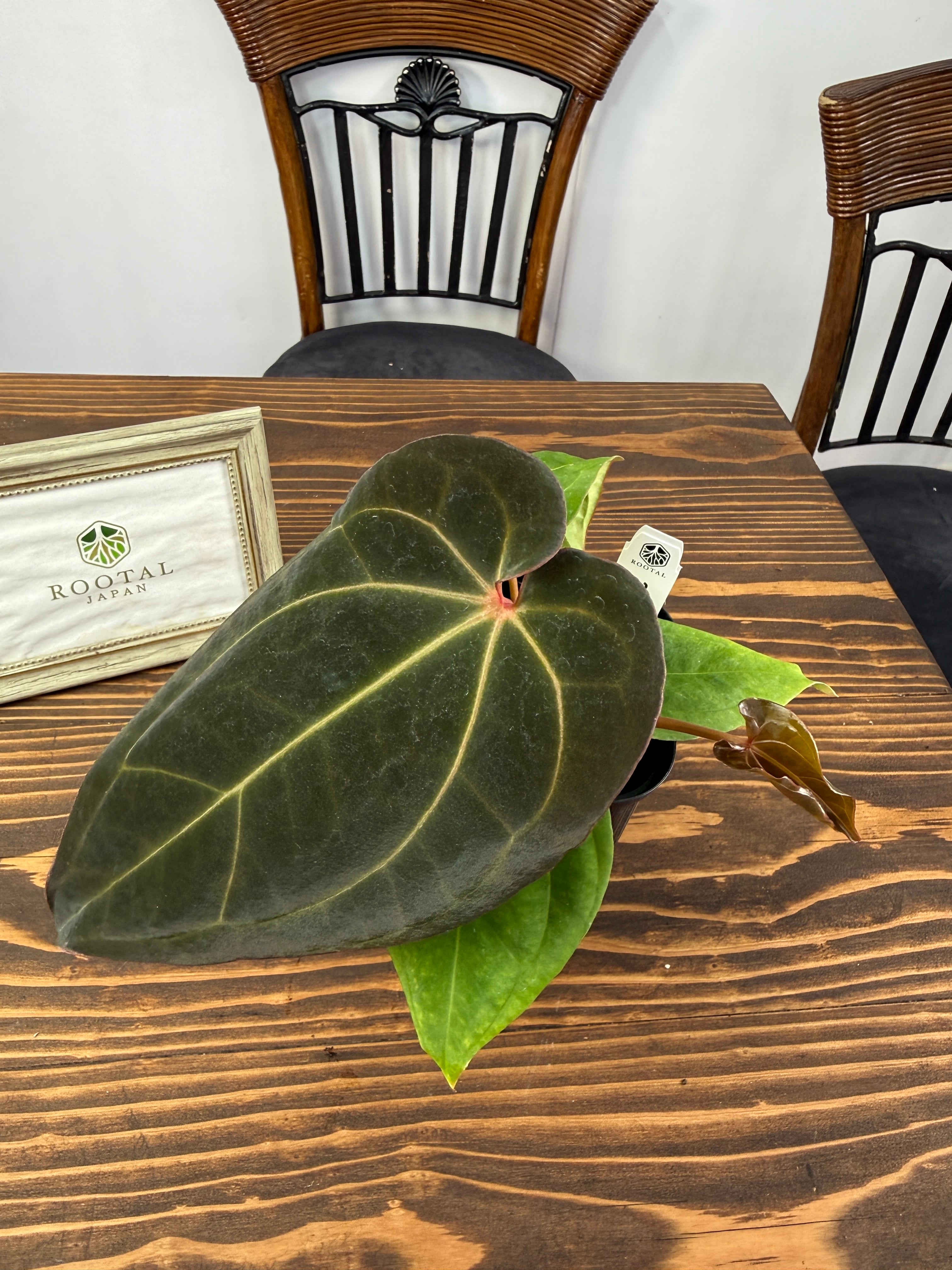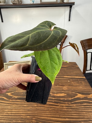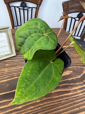 アンスリウム ミッシェル×ザラ×BVEPの葉は深い緑色に艶やかな光沢を持ち、圧倒的な存在感を放ちます。コンパクトですが健康的に成長した個体をお届けいたします。