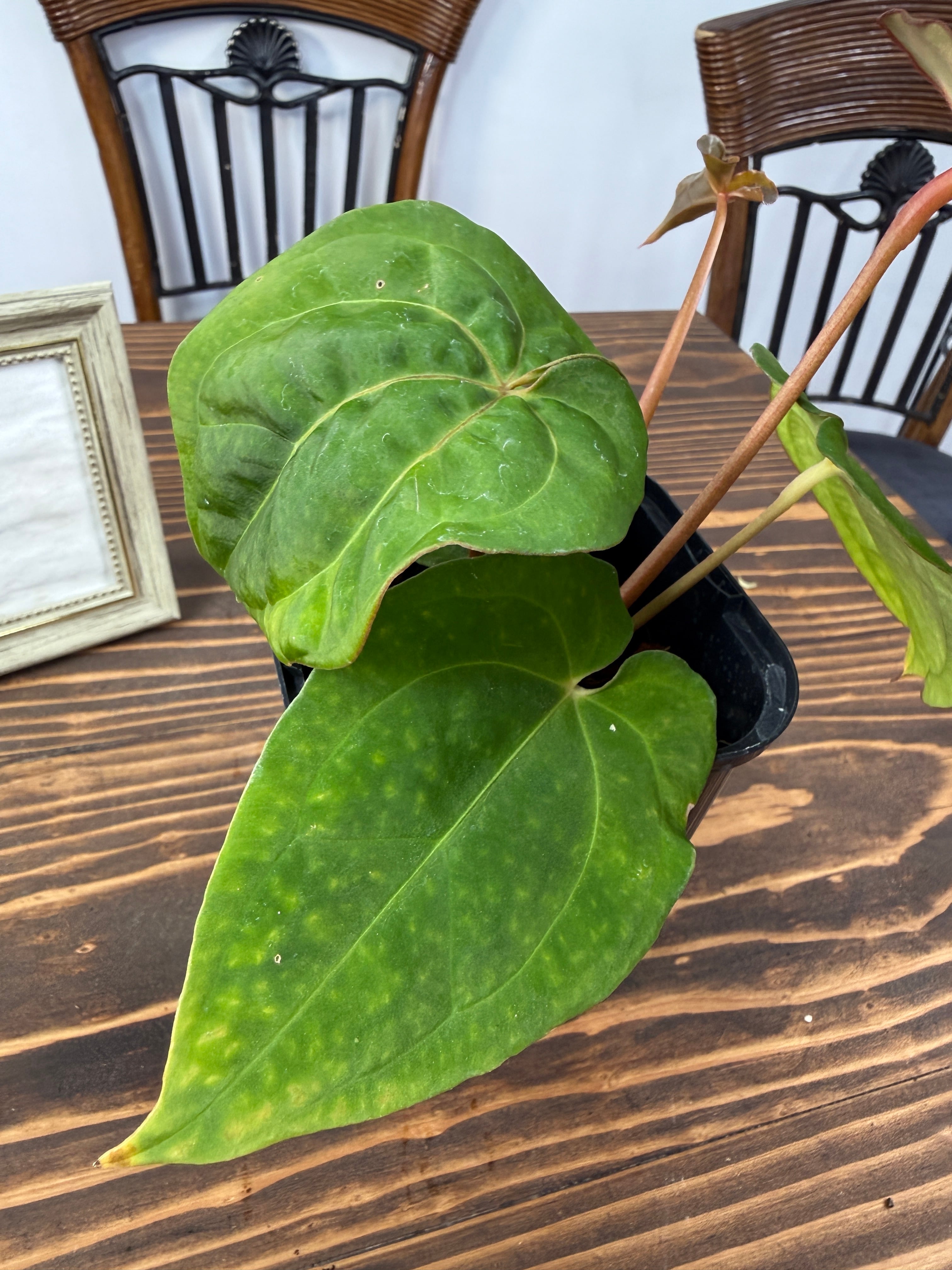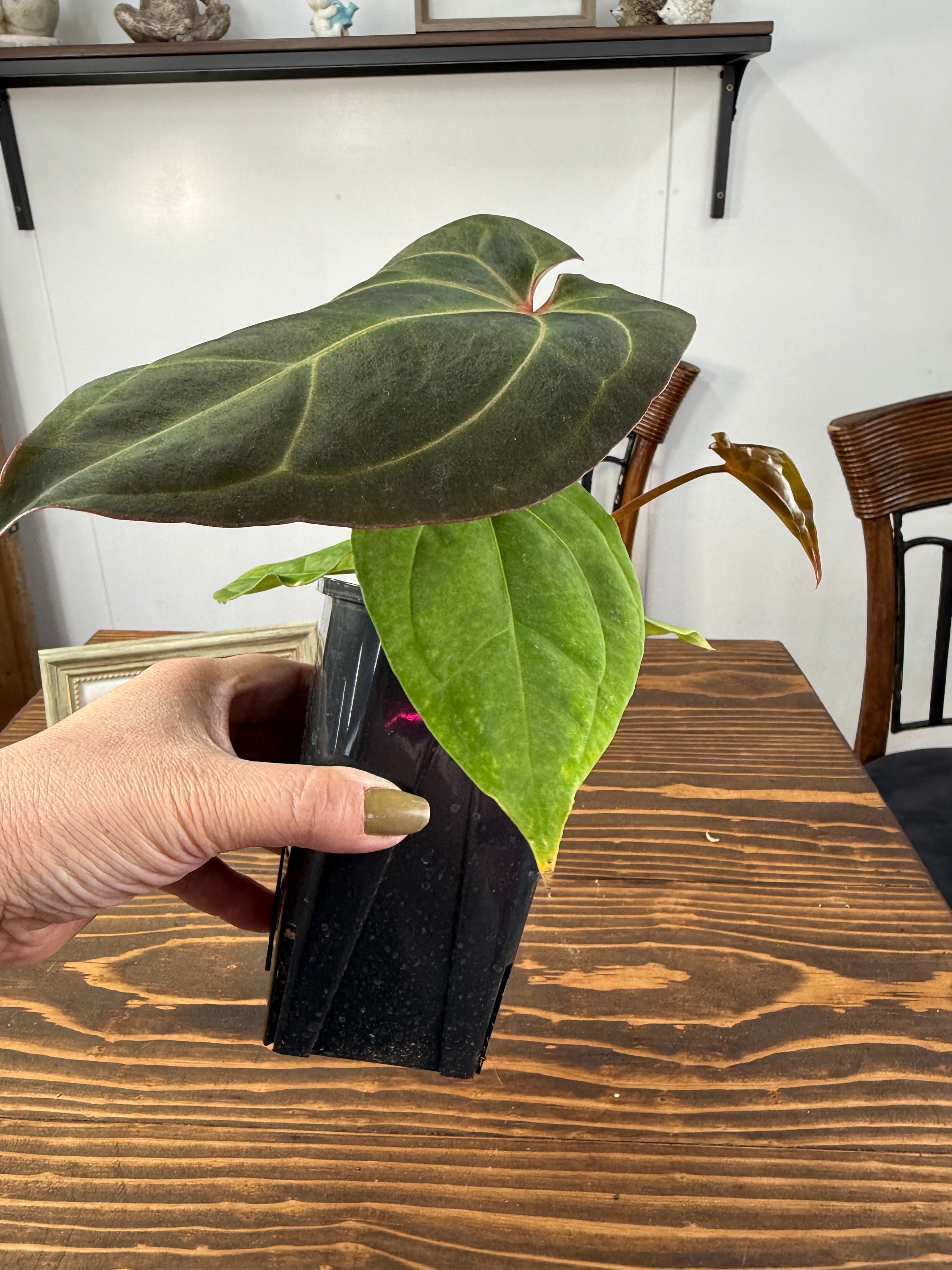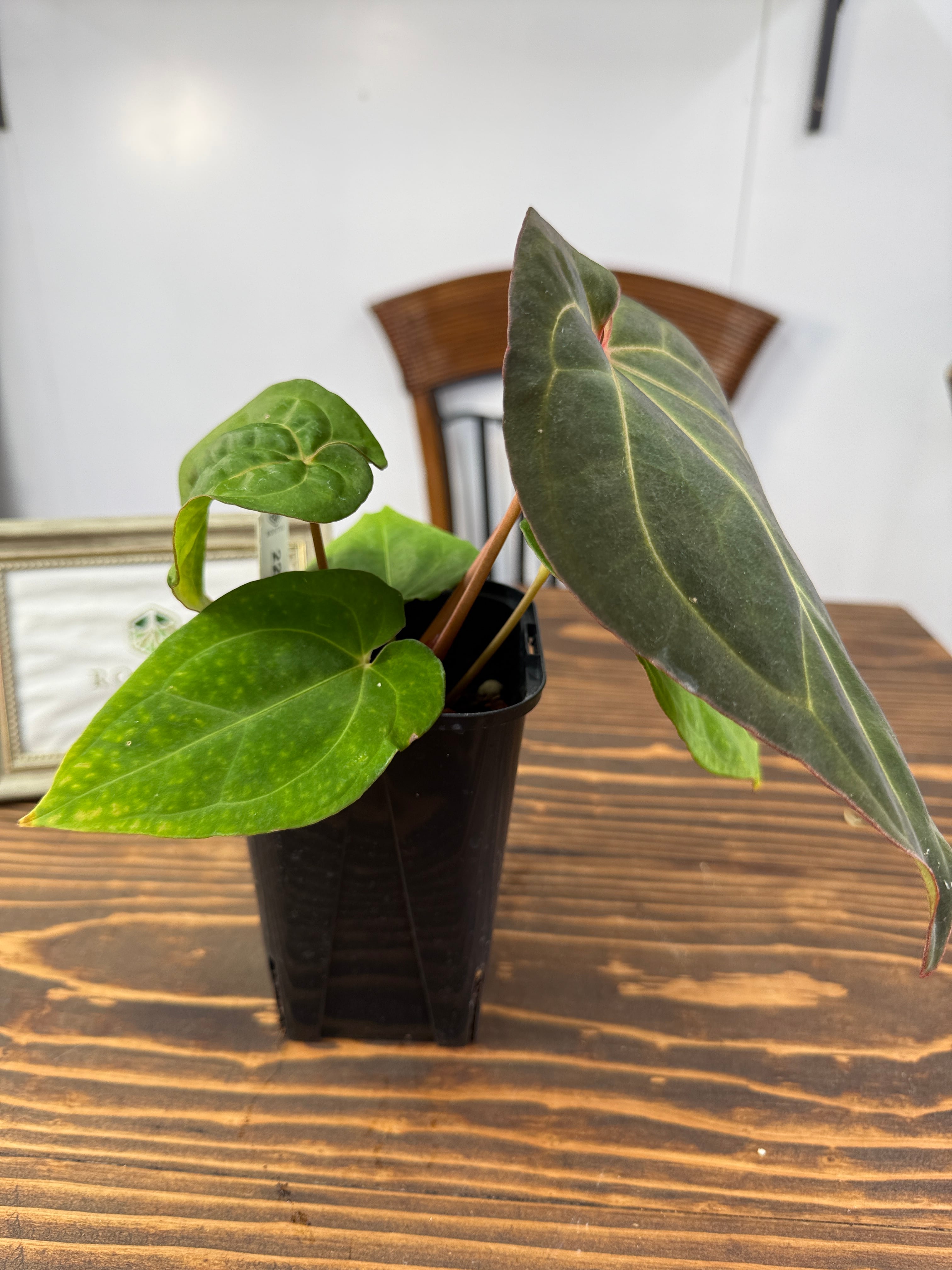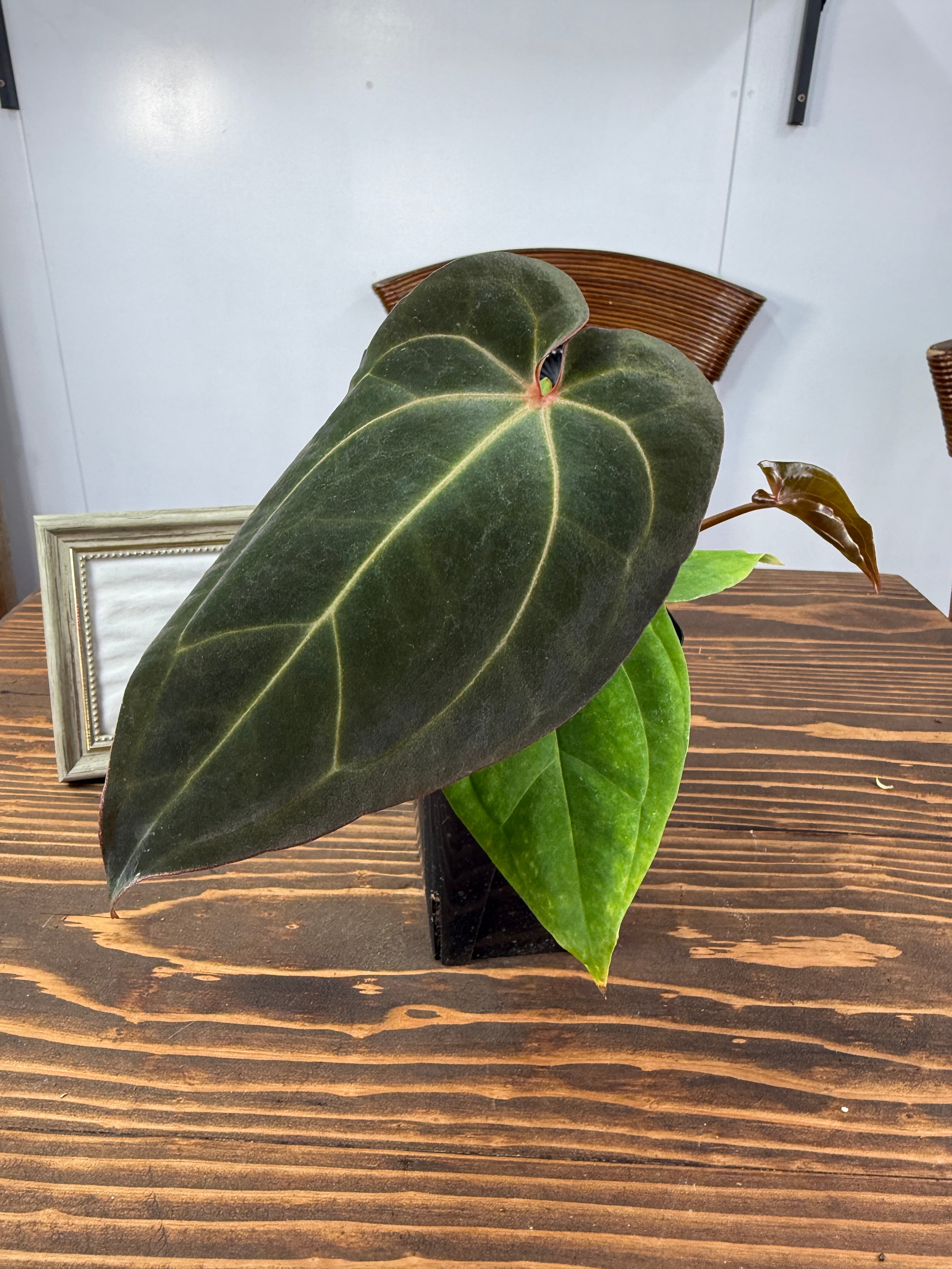 アンスリウム ミッシェル×ザラ×BVEPの葉は深い緑色に艶やかな光沢を持ち、圧倒的な存在感を放ちます。コンパクトですが健康的に成長した個体をお届けいたします。