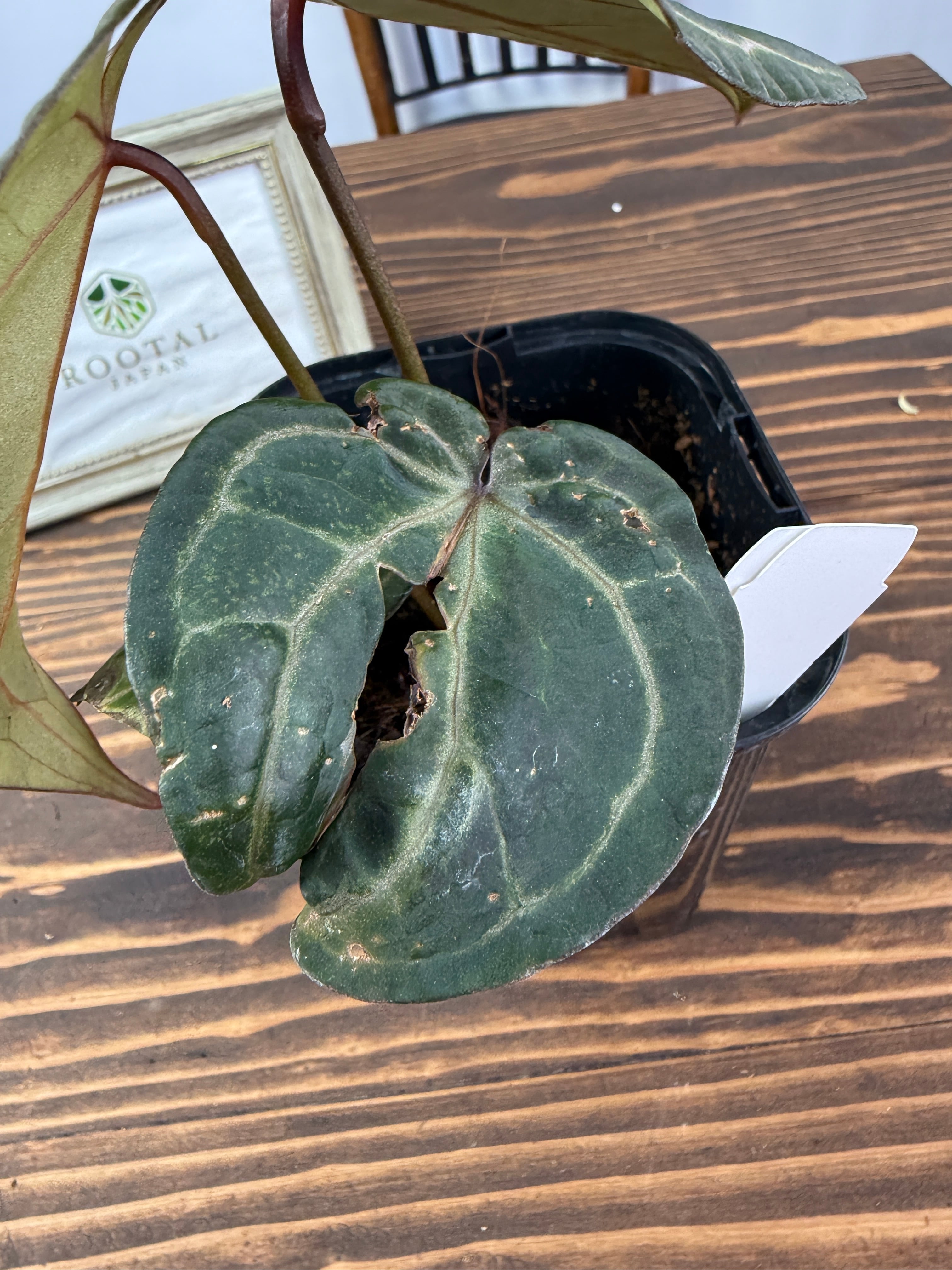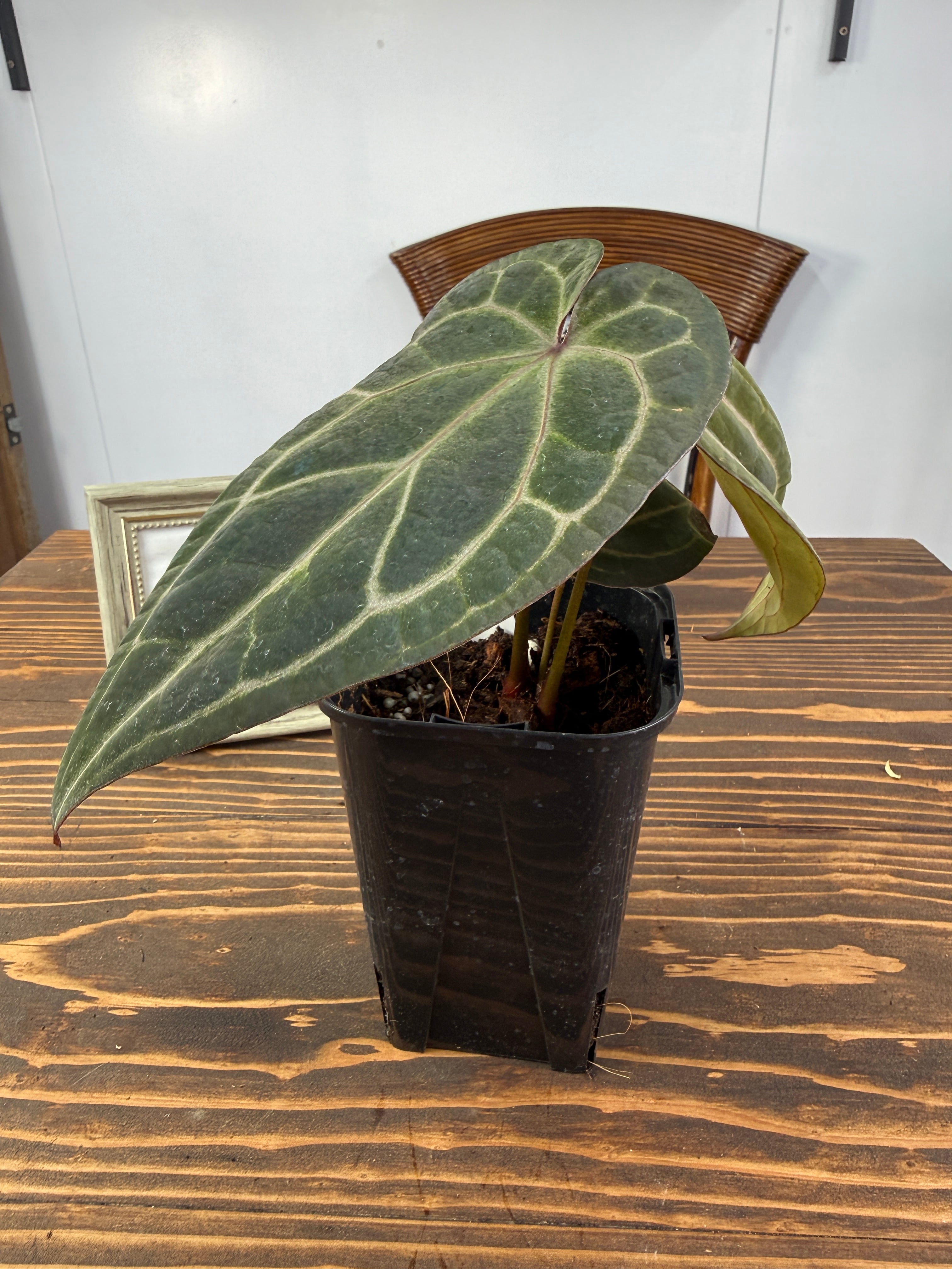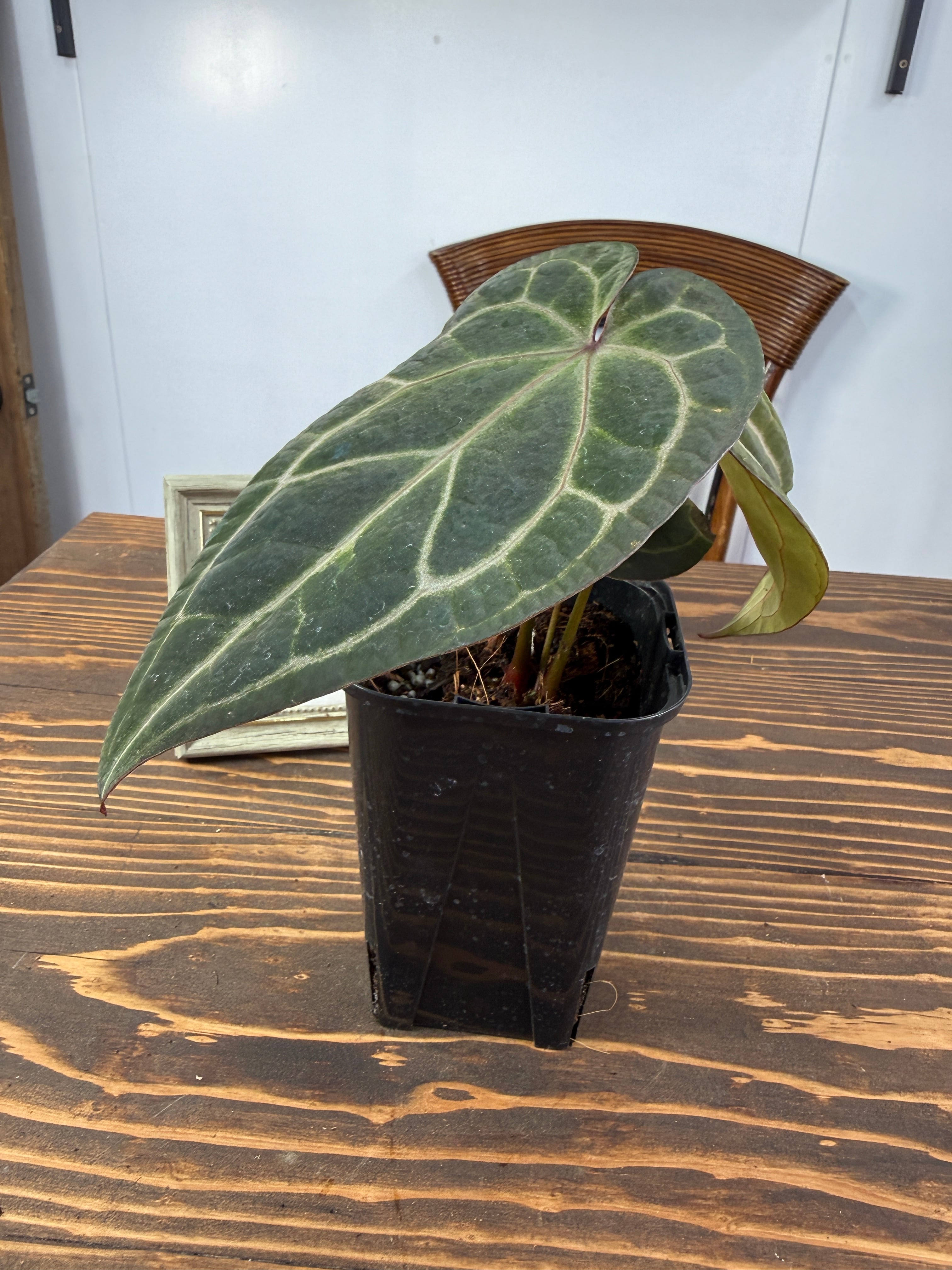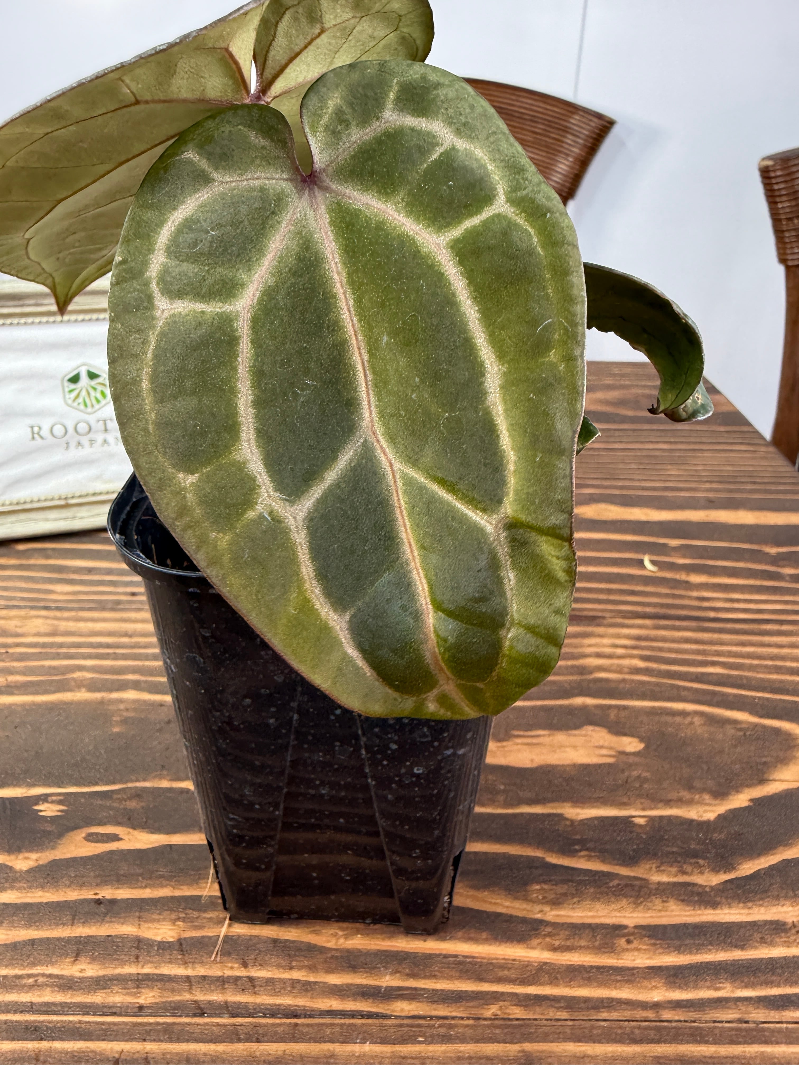 このアンスリウムは明るい間接光を好み、過度の日光は避けた方が良いです。土の表面が乾いた際にはしっかりと水を与え、湿度を高めに保つことで元気に育ちます。また、温度は20〜30度が適しているため、快適な環境を整えてあげてください。