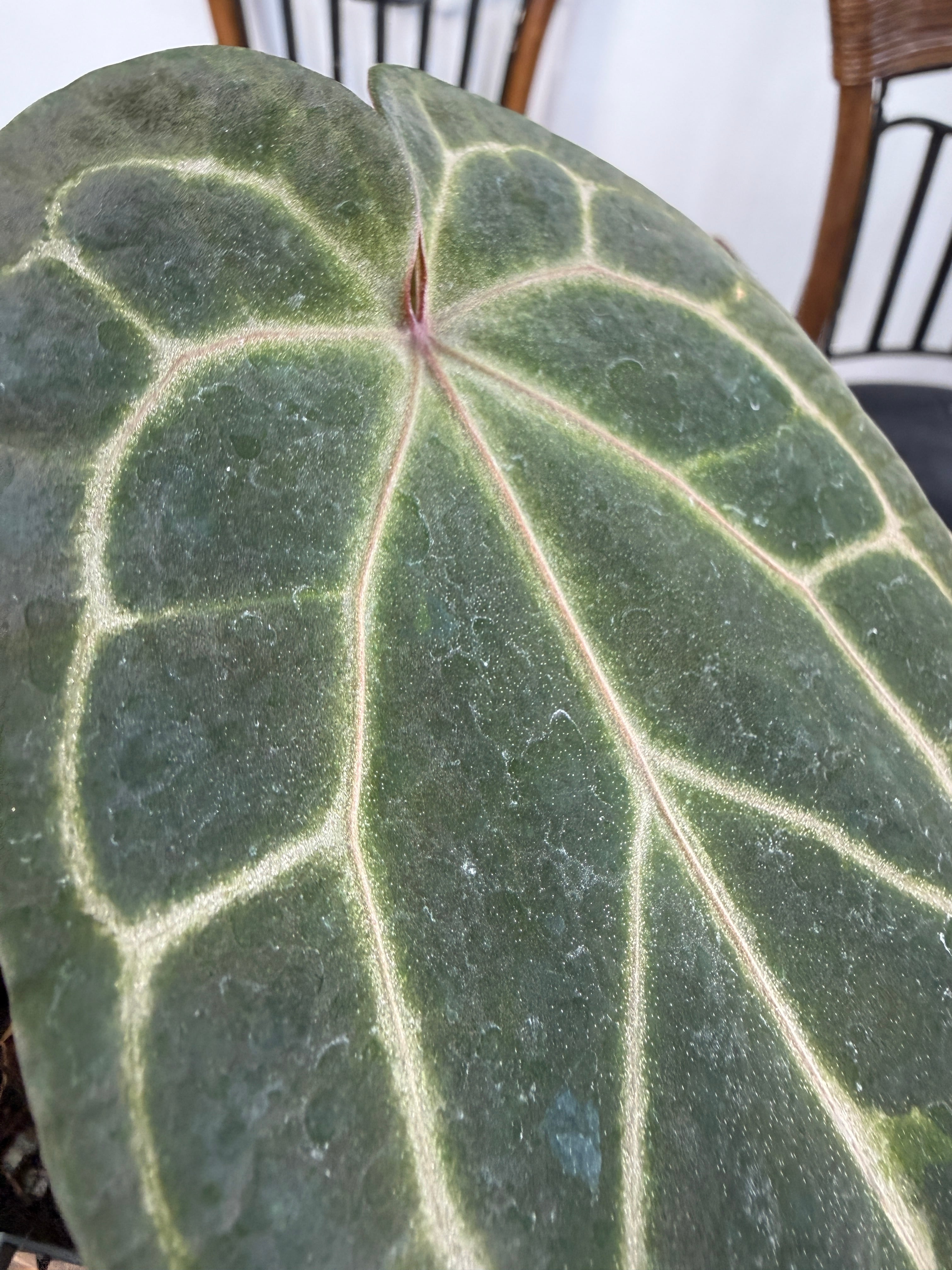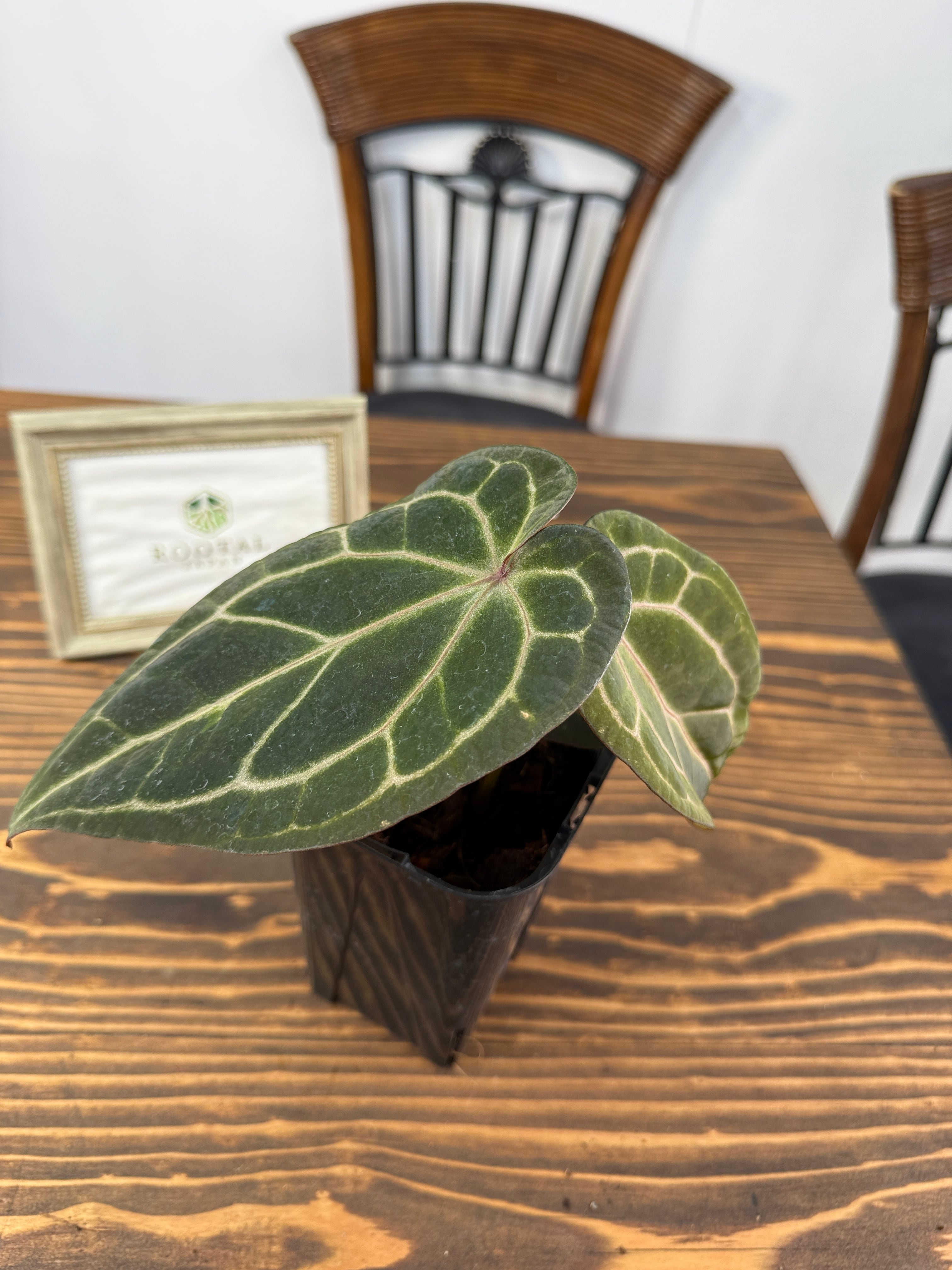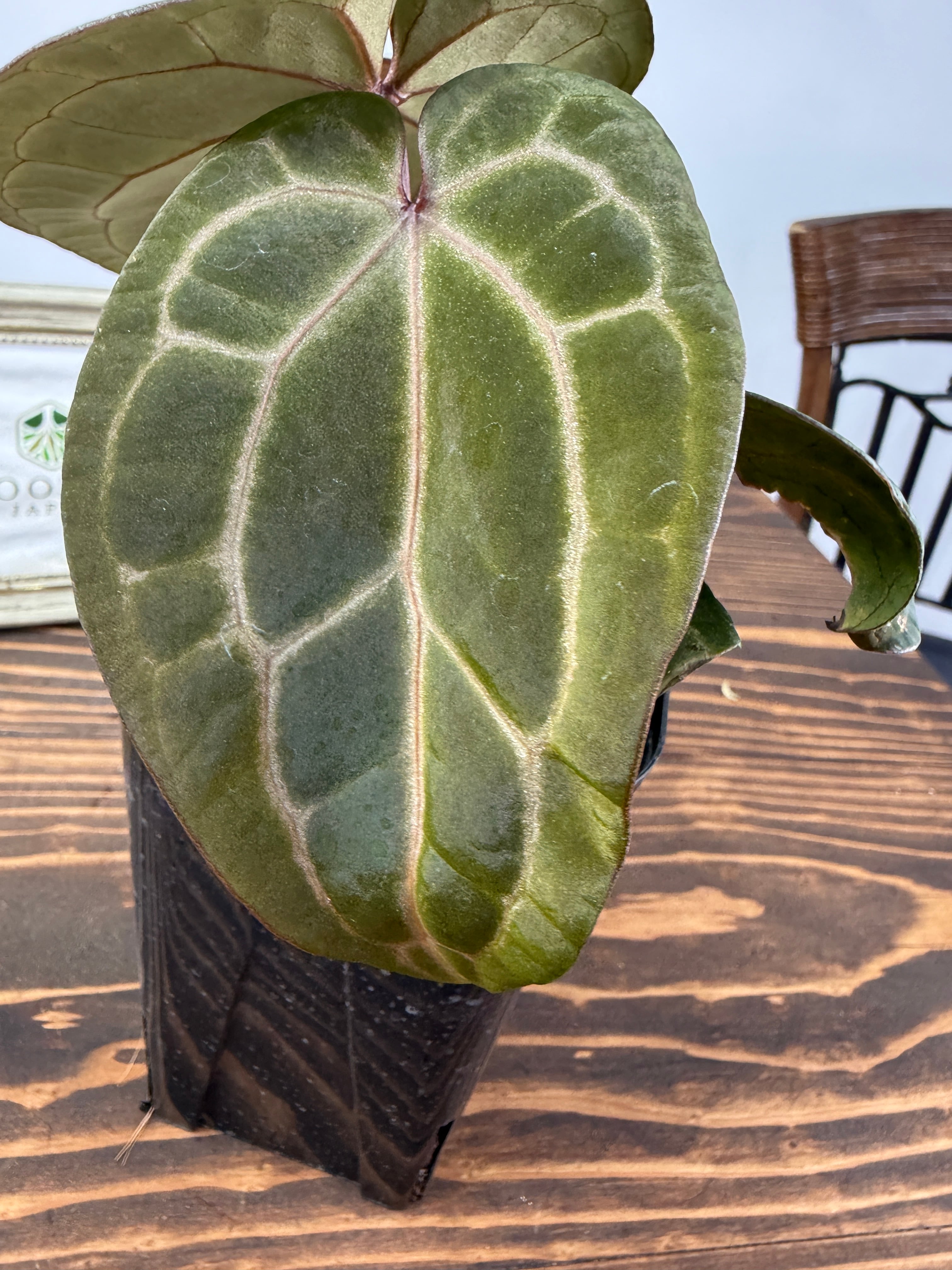 このアンスリウムは明るい間接光を好み、過度の日光は避けた方が良いです。土の表面が乾いた際にはしっかりと水を与え、湿度を高めに保つことで元気に育ちます。また、温度は20〜30度が適しているため、快適な環境を整えてあげてください。
