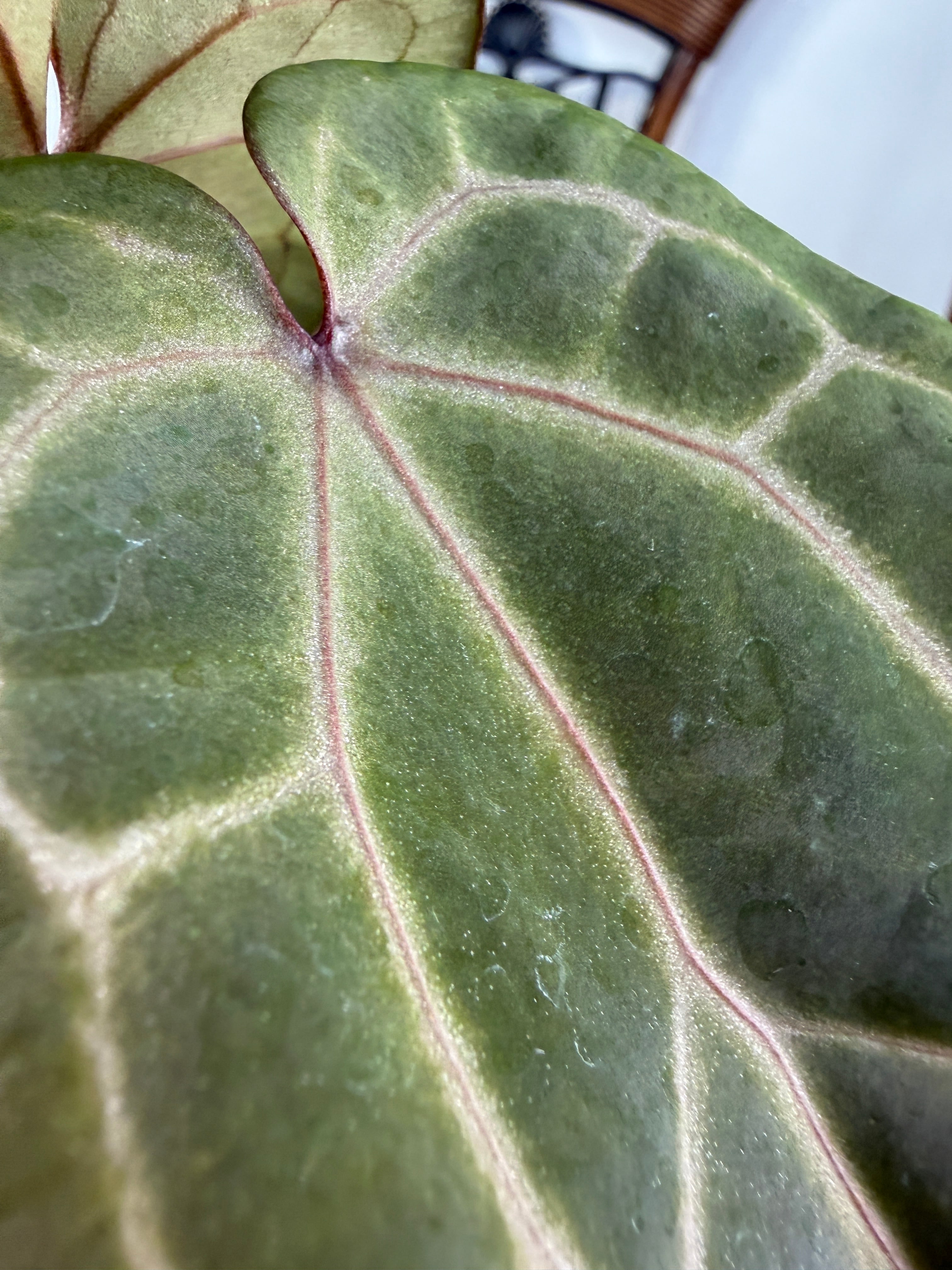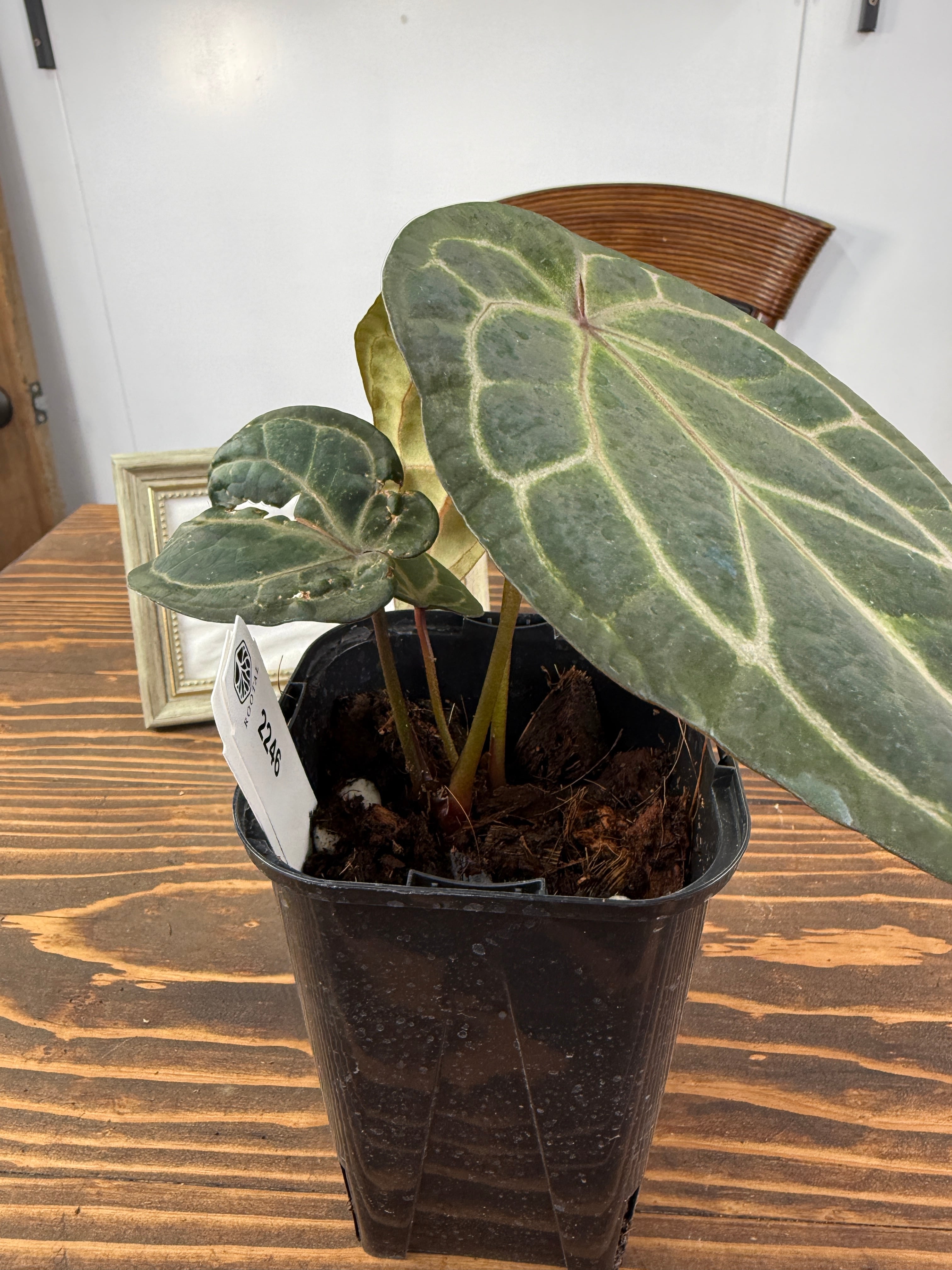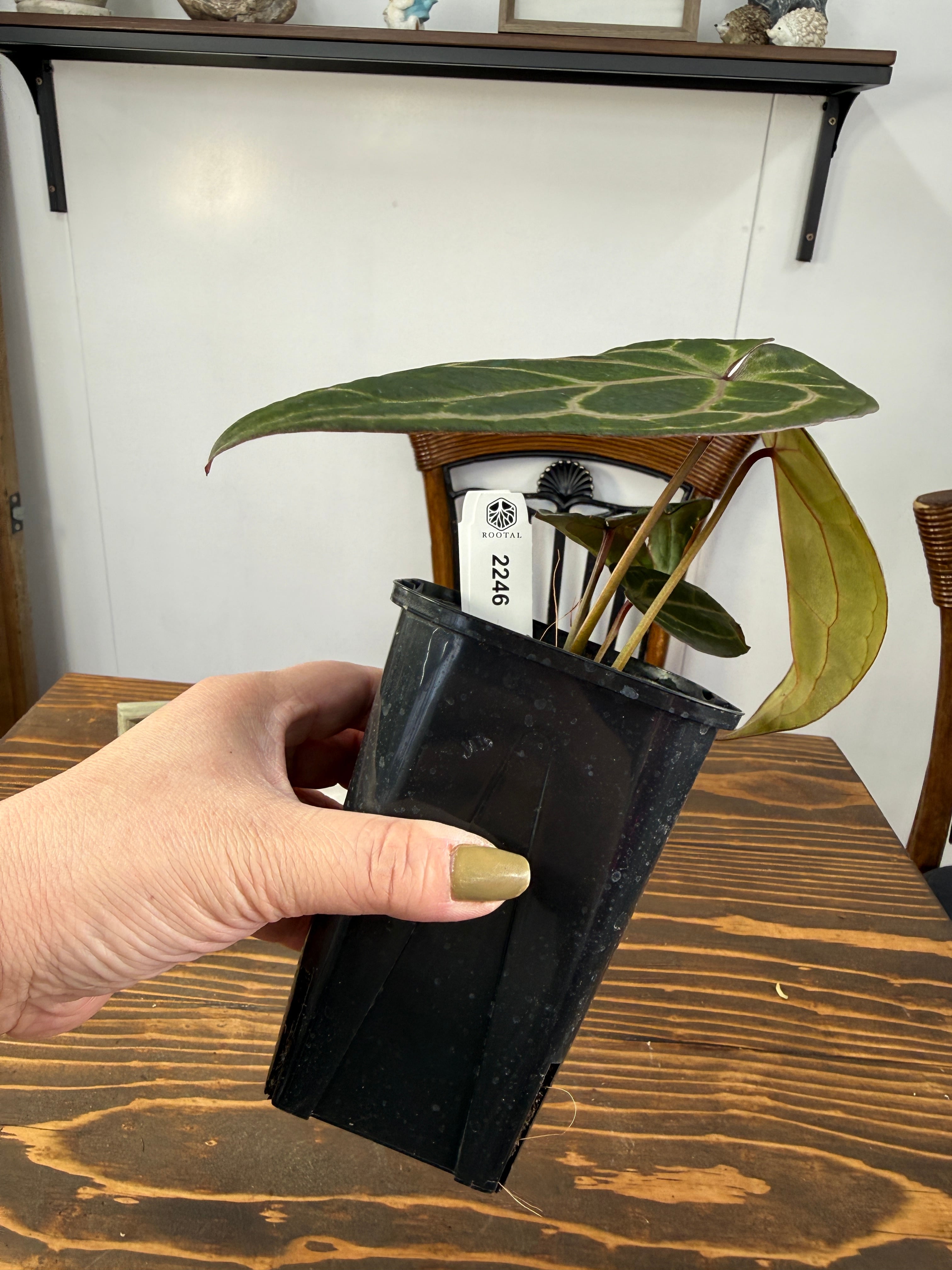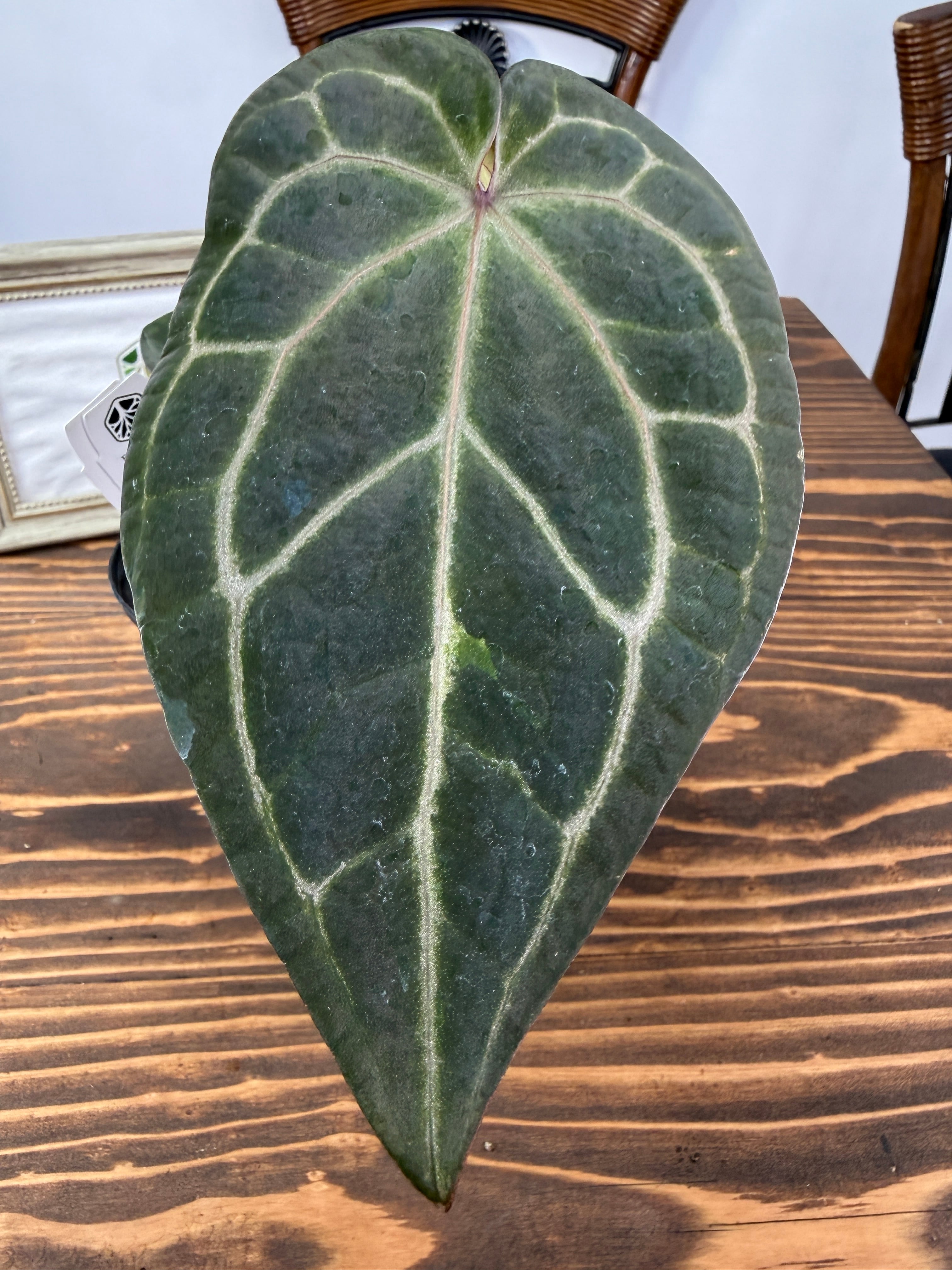 このアンスリウムは明るい間接光を好み、過度の日光は避けた方が良いです。土の表面が乾いた際にはしっかりと水を与え、湿度を高めに保つことで元気に育ちます。また、温度は20〜30度が適しているため、快適な環境を整えてあげてください。