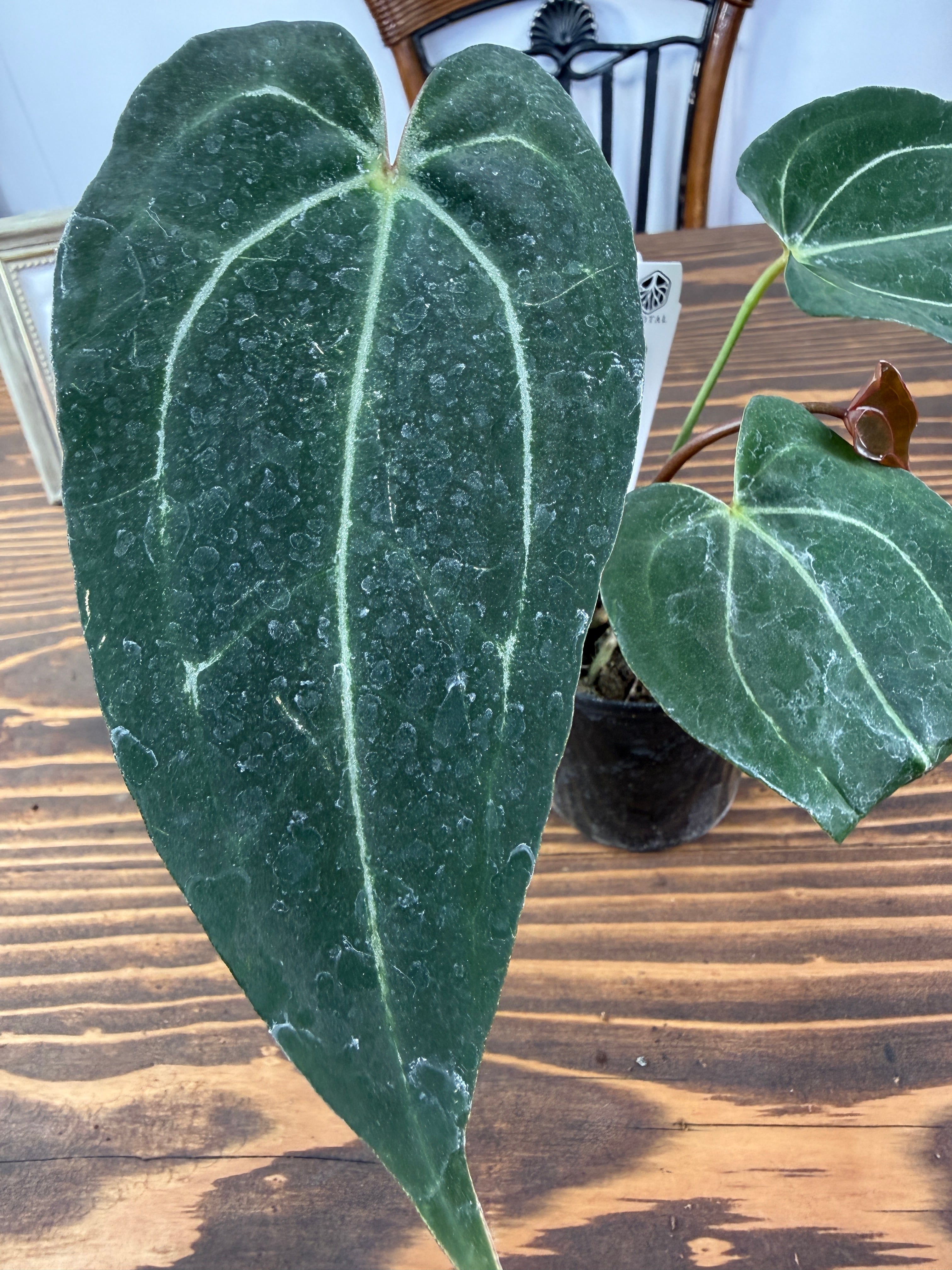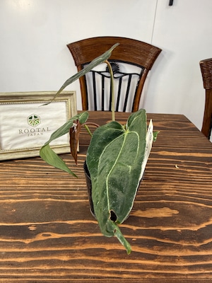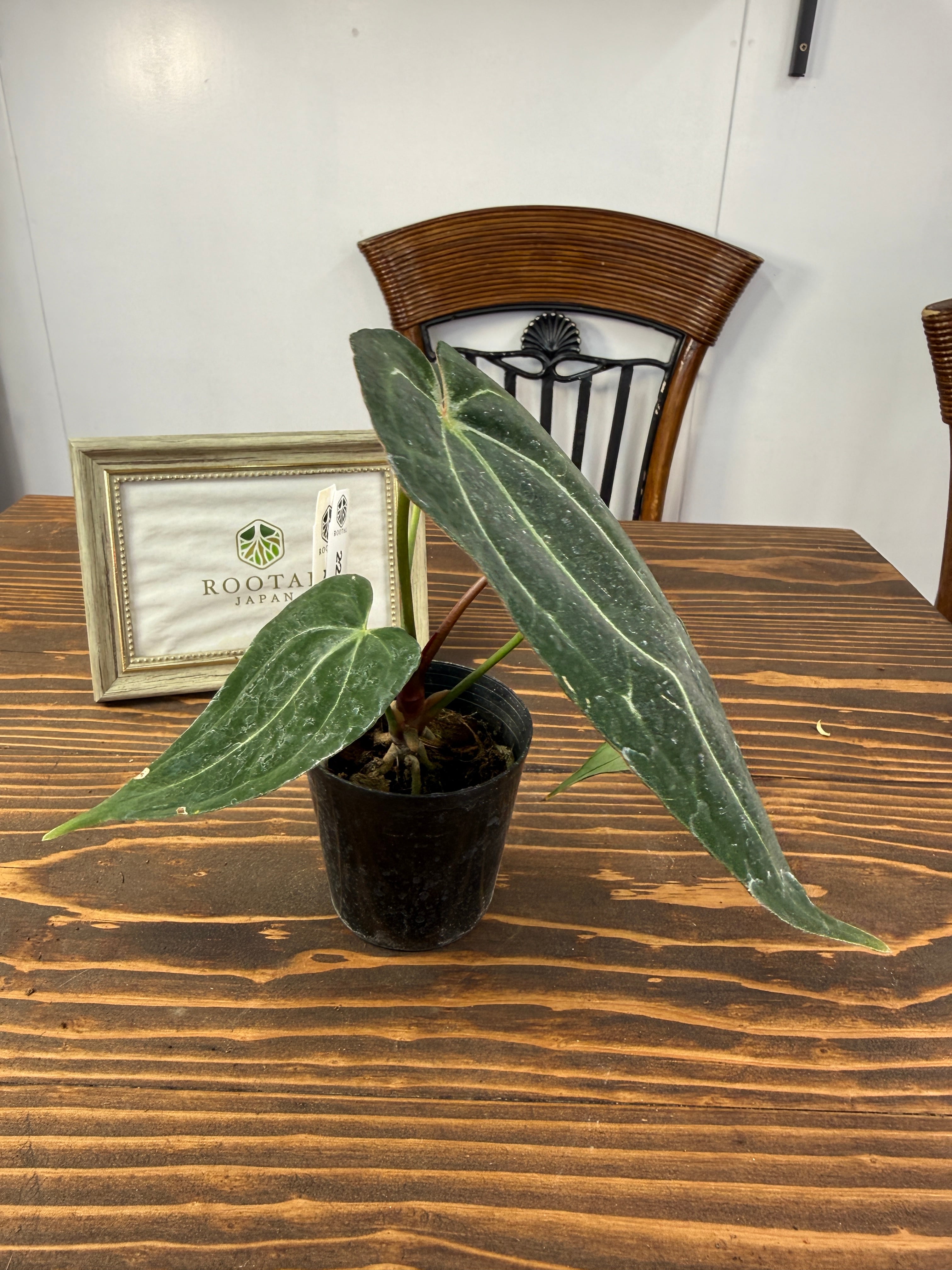 アンスリウム エンジェルスD×レッドスパイダーの葉は、深い緑色に光沢を持ち、独特なフォルムが存在感を引き立てます。出荷時のサイズは2.5号プラ鉢で、コンパクトながら健康的に育った美しい個体をお届けいたします。