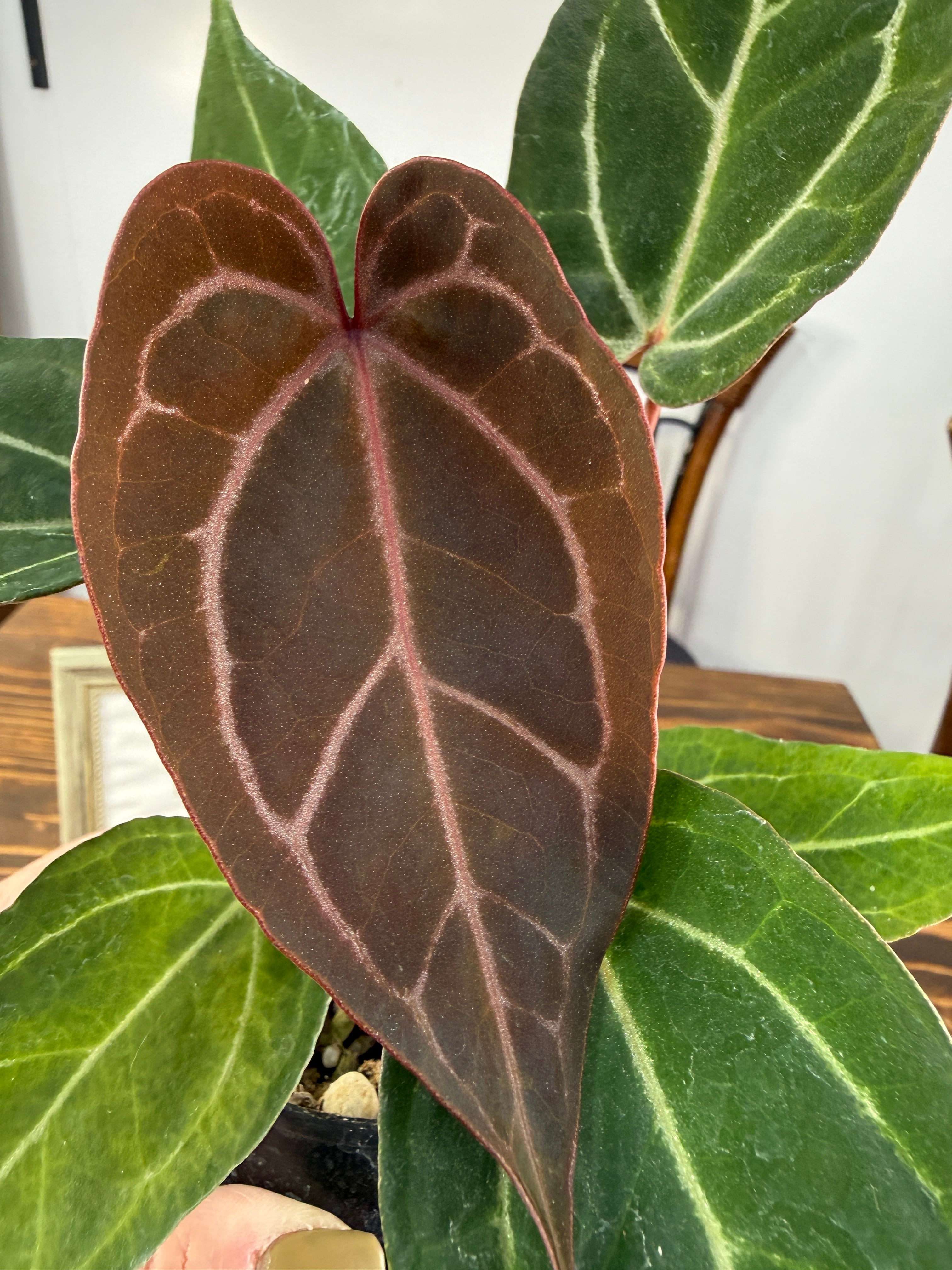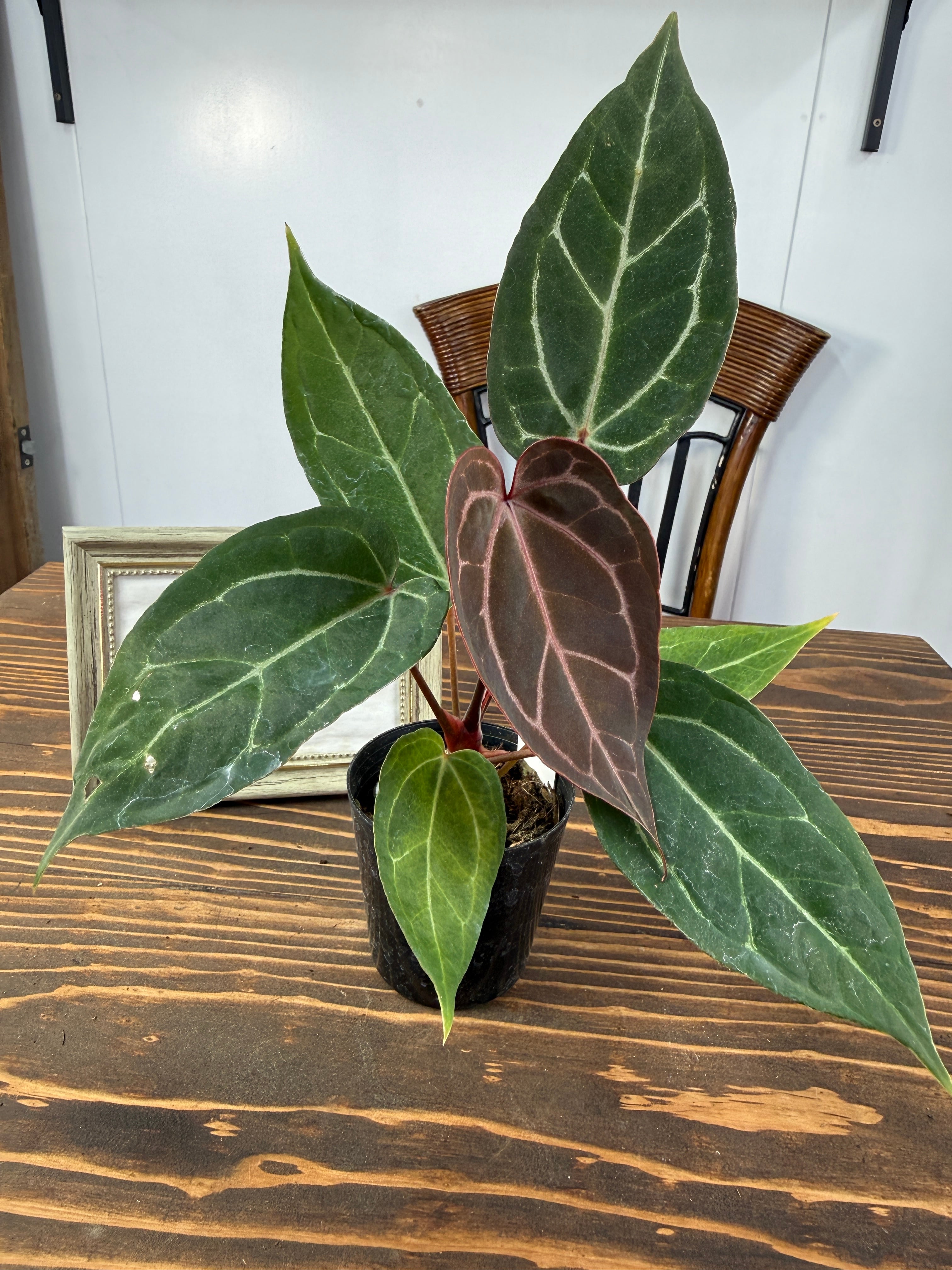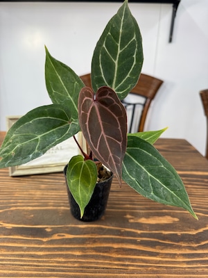 アンスリウム エンジェルスD×レッドスパイダーの葉は、深い緑色に光沢を持ち、独特なフォルムが存在感を引き立てます。出荷時のサイズは2.5号プラ鉢で、コンパクトながら健康的に育った美しい個体をお届けいたします。
