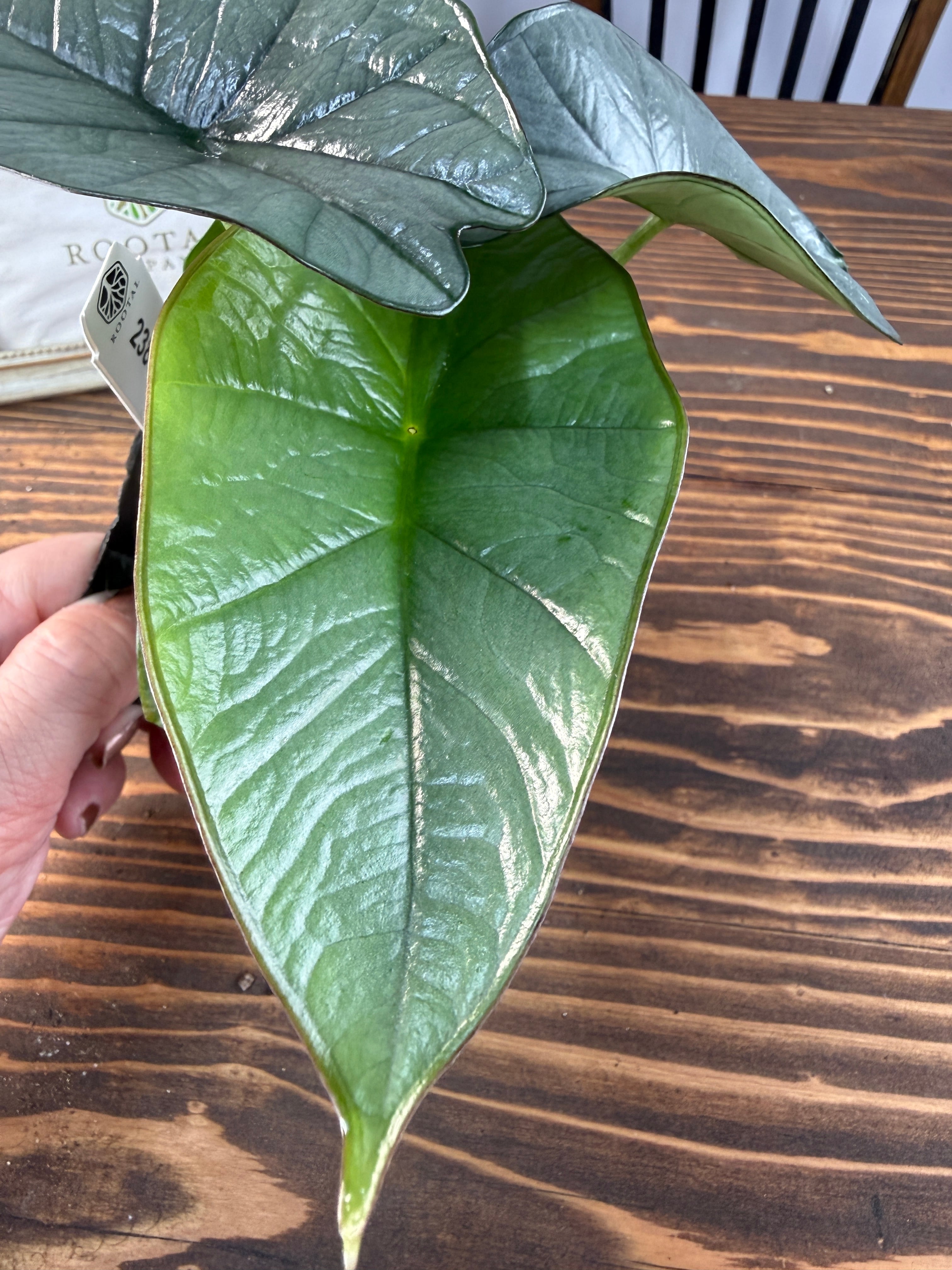 アロカシア レギネは、濃い緑色の葉表に美しい明るいエッジが施され、まるで自然のアートのようです。サイズは4号ポットで、約15㎝前後の健全な個体をお届けします。リビングやオフィスのデスクに置くことで、洗練された空間を演出します。