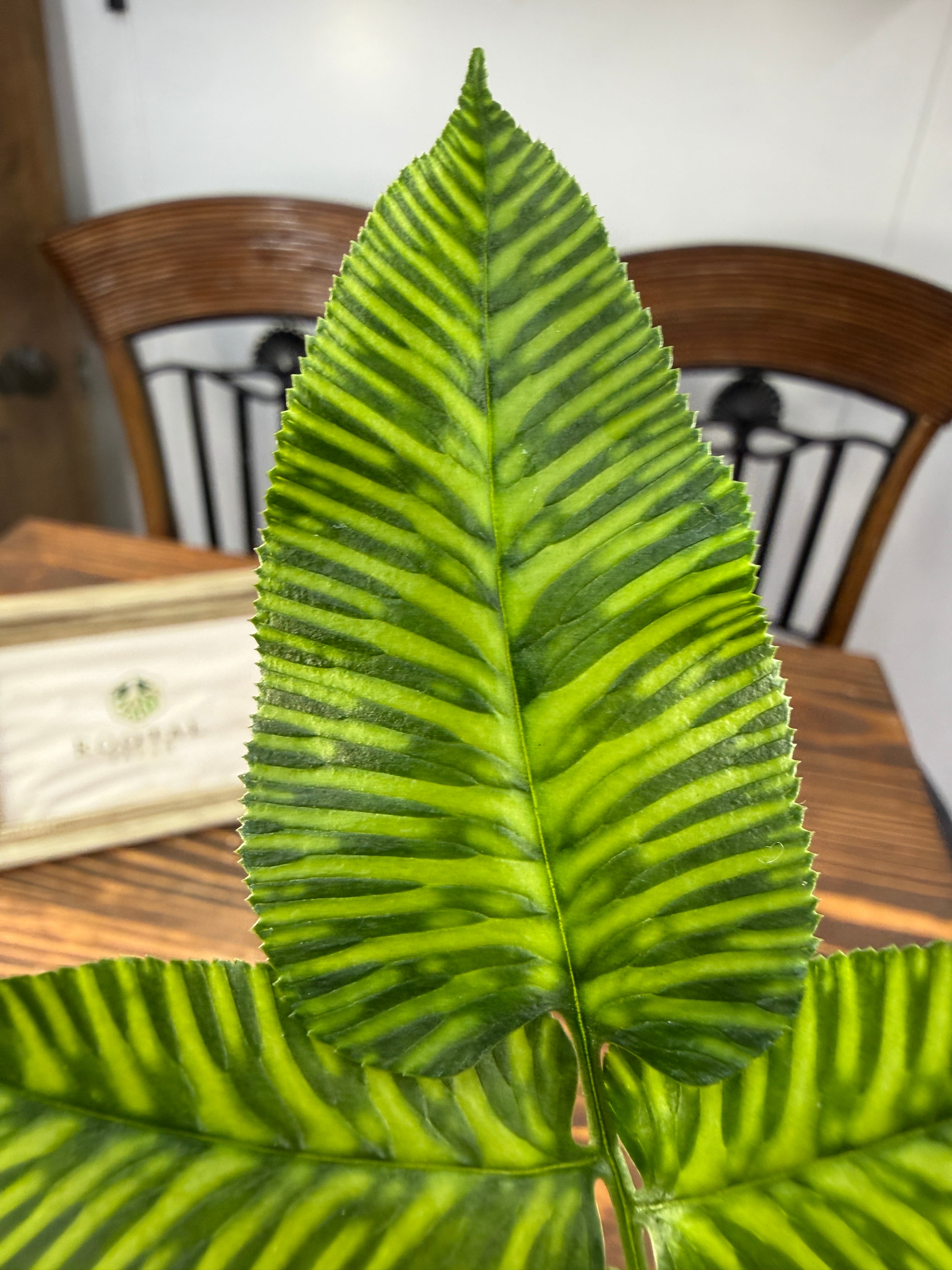 コニオグランメ エメイエンシスは、深い緑色の葉に繊細なギザギザが際立ち、まるで自然が創り出したアートのようです。サイズは3.5号ポットで、約15cm前後の健康な個体をお届けします。リビングやエントランスに置くことで、洗練された雰囲気を演出します。