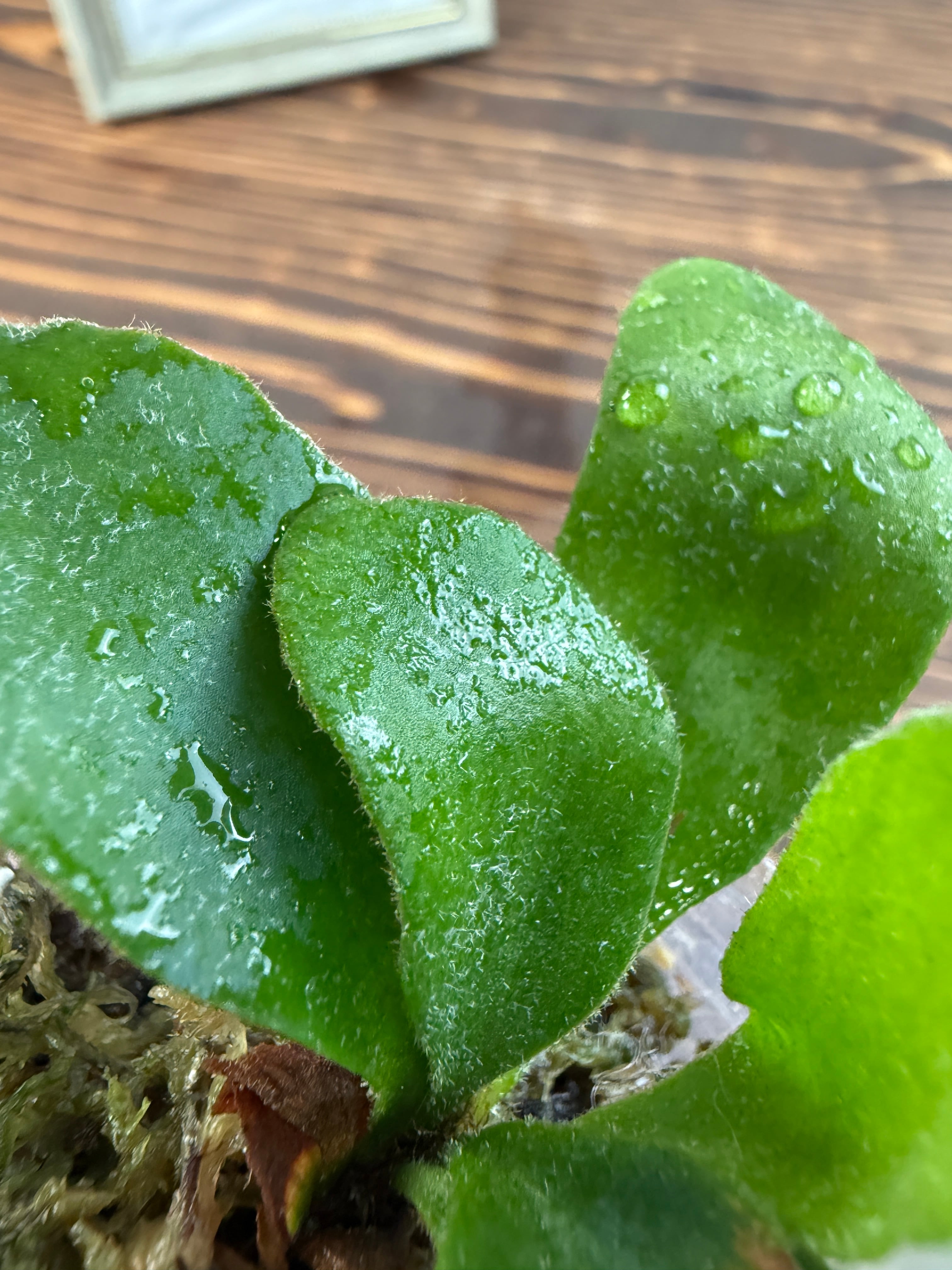 育成の際は、直射日光は避け、明るい間接光の下で育てることが大切です。土の乾燥具合を確認し、適度な水分を与えることがポイントです。温度は15〜25度を目安に管理し、高湿度を好むビカクシダの特徴を活かすため、定期的な葉水もおすすめです。